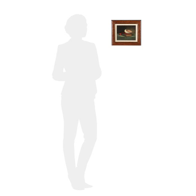 Oil on panel, signed at lower right, presented in a burlwood frame.