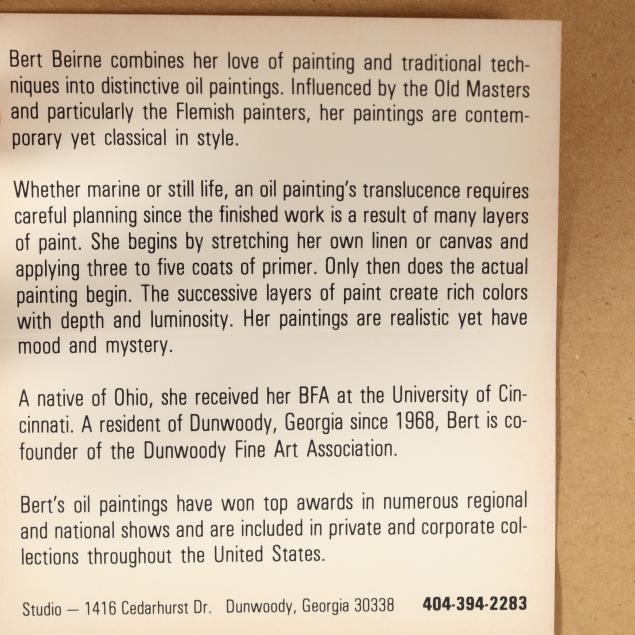 Originally from Cincinnati, Beirne has lived in the Atlanta area since 1968. She is highly respected for her still life paintings which are influenced by 17th century Flemish masters.