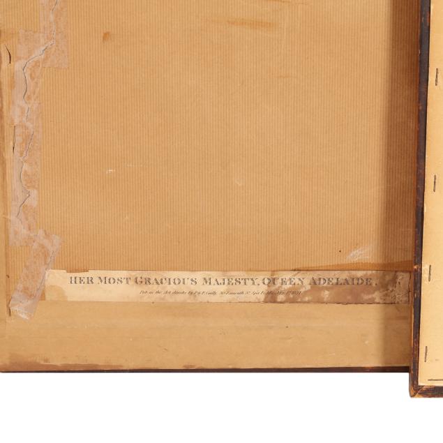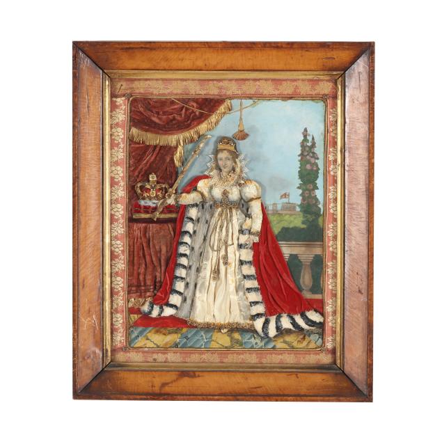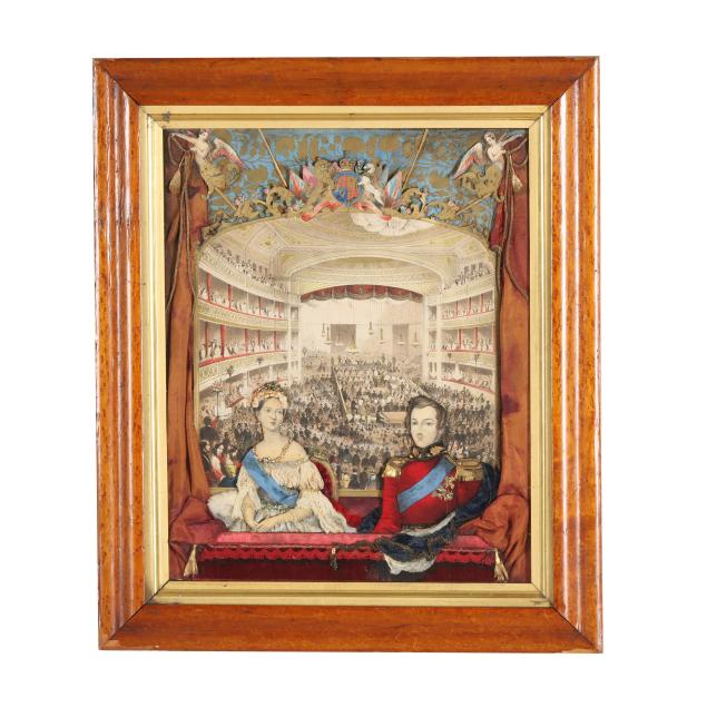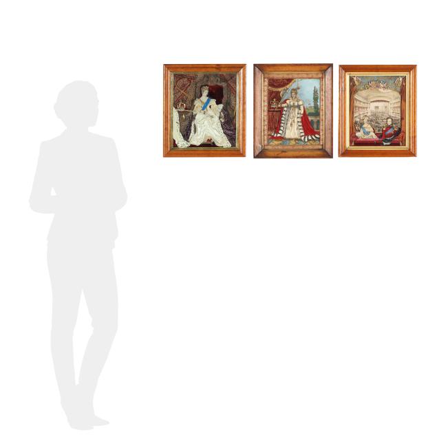 First half 19th century, mixed media collages featuring hand-embellished prints of English royals decorated with paper, fabrics, needlework, metal cutouts, and jewels, each set within old wooden frame below glass: the first depicting Queen consort Adelaide of Saxe-Meiningen (r. 1830-1837), with original etching label affixed to verso (18 1/2 x 15 1/4 x 1 1/2 in.); the second depicting a young Queen Victoria (r. 1837-1901) (18 x 15 3/4 x 1 in.); the third depicting Queen Victoria and Prince Albert at Covent Garden Theater, labeled to verso (18 x 15 x 1 in.).