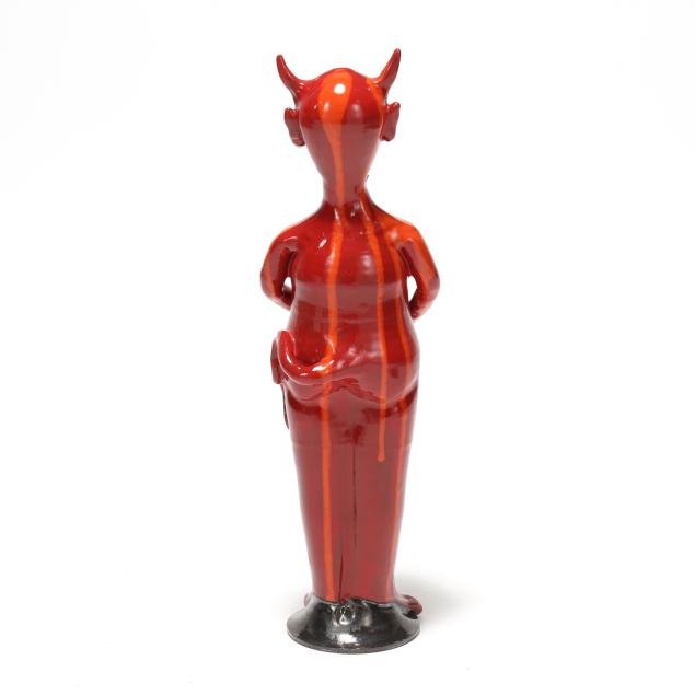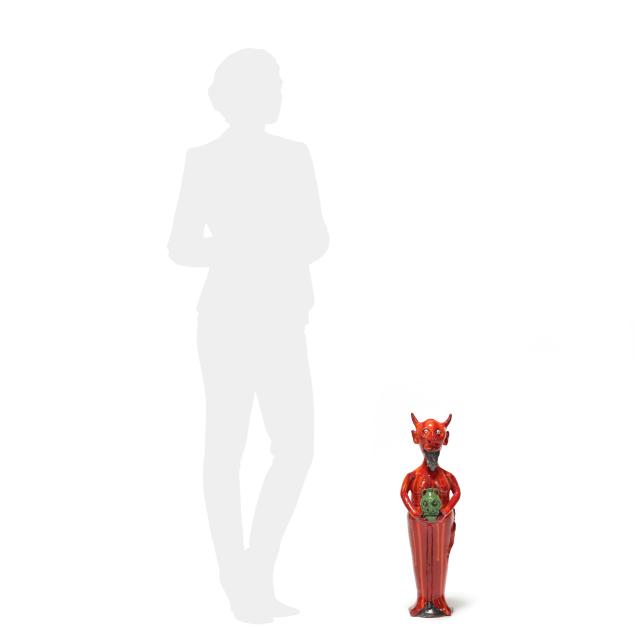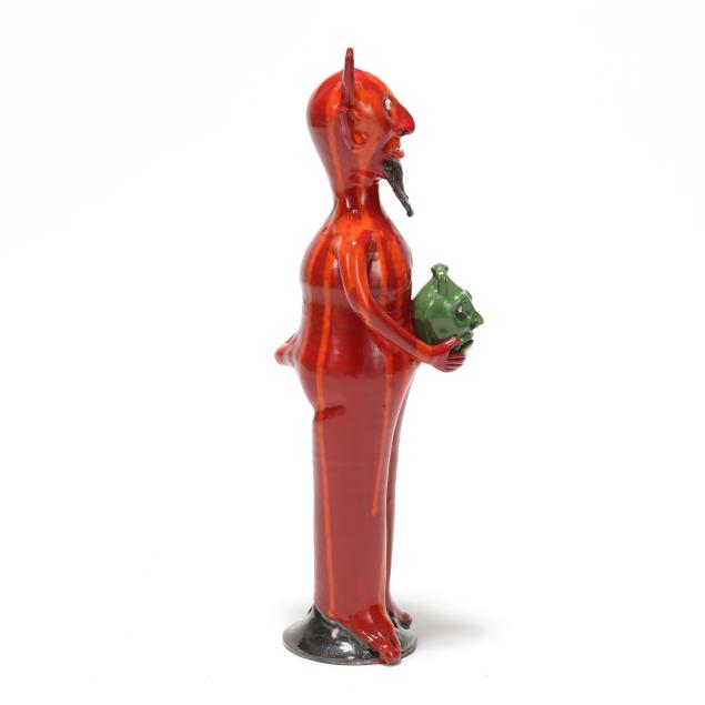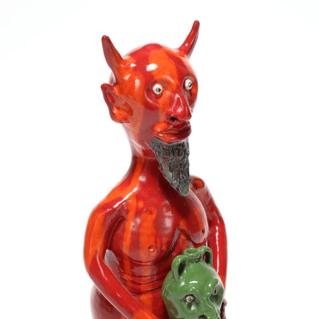 Polychrome glazed earthenware sculpture of bearded and horned devil holding a face jug, inscribed "Marvin Bailey" to underside.