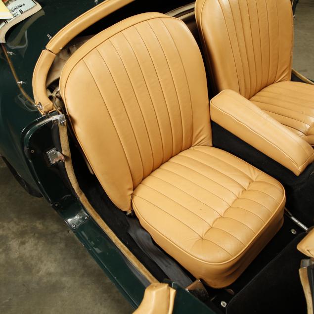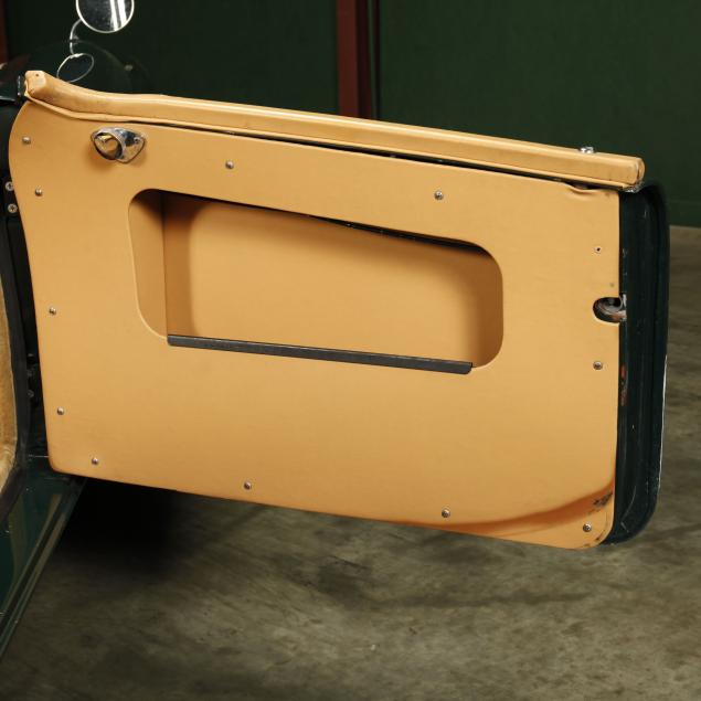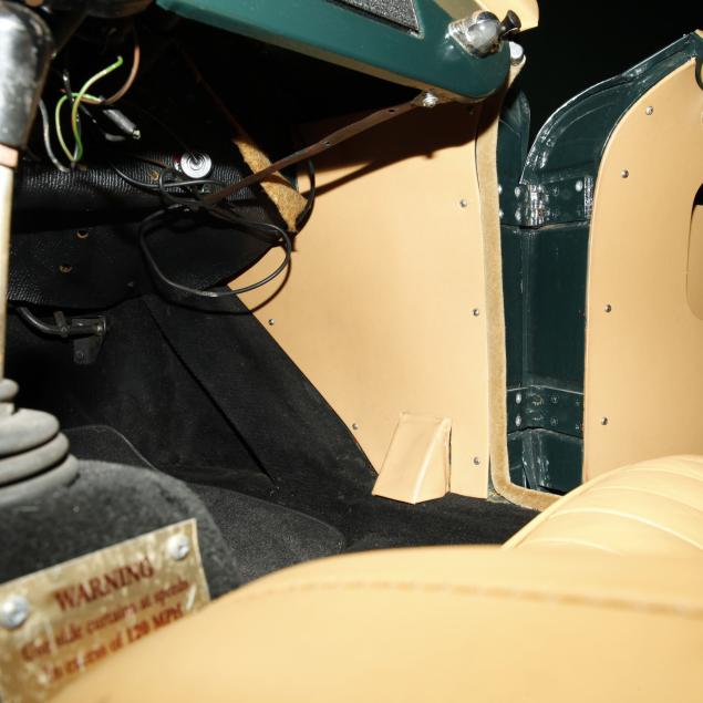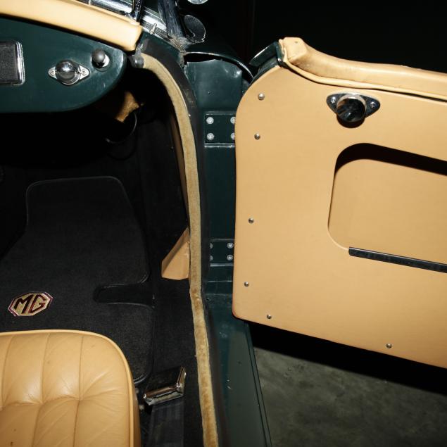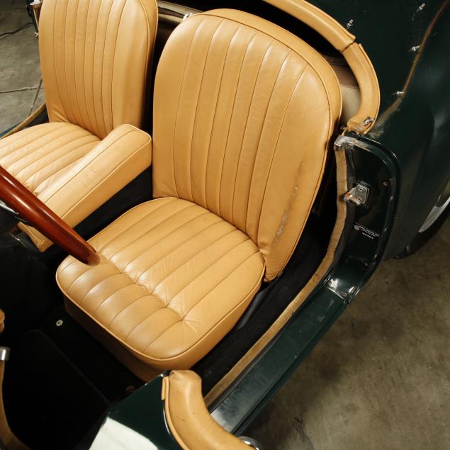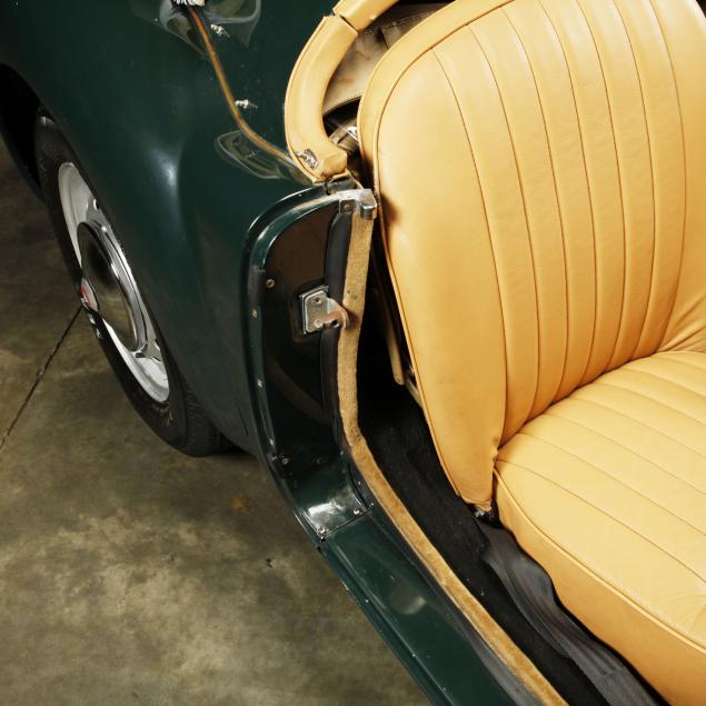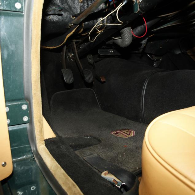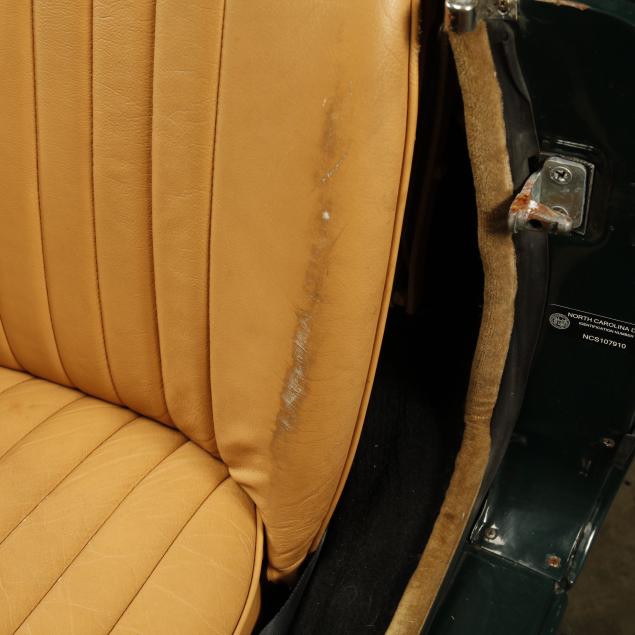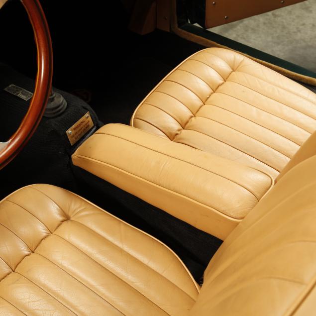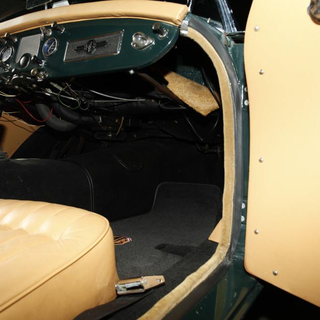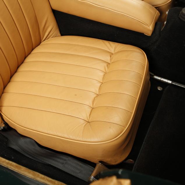Exterior in British racing Green, with a new interior installed in Honey Tan leather seats. Black Carpets were installed with fasteners. The floor pans were replaced, as well as the "B" pillars and sills during the restoration. The chassis was treated with Waxoyl. A Nardi steering wheel was added, with the original remaining.