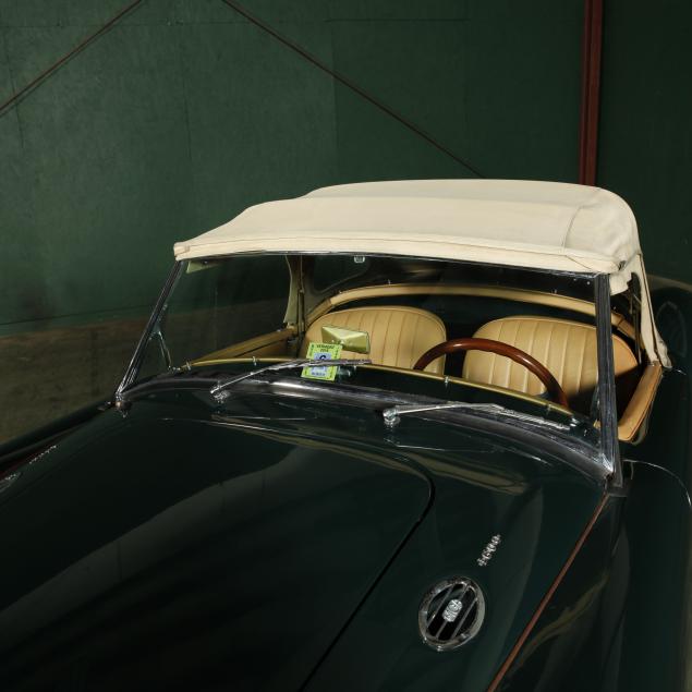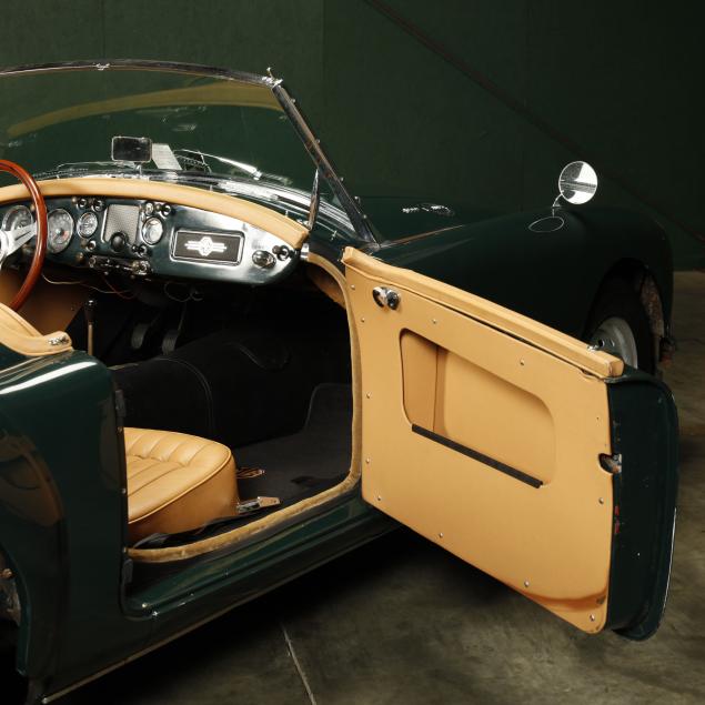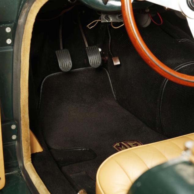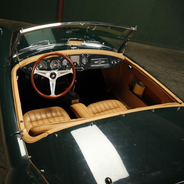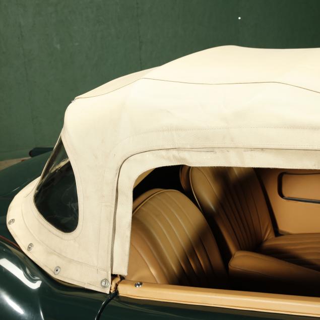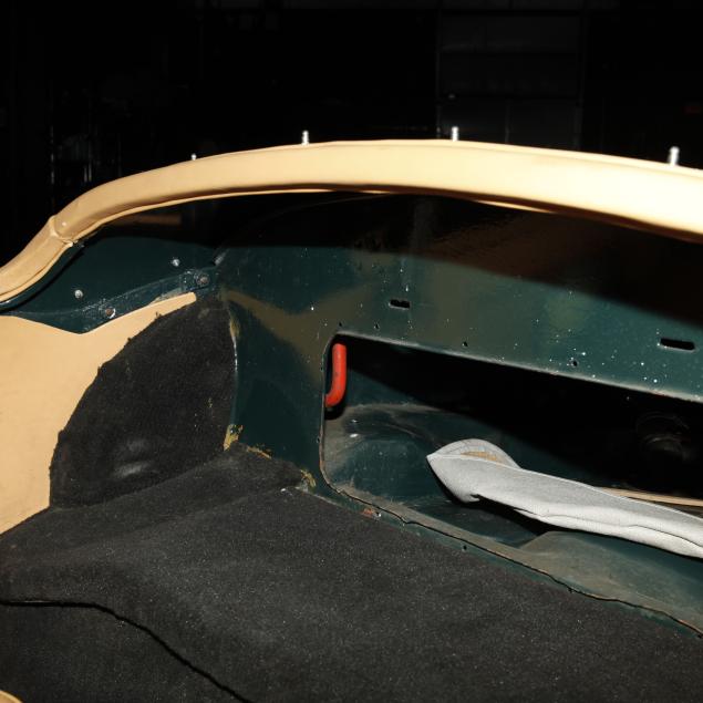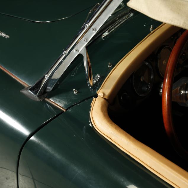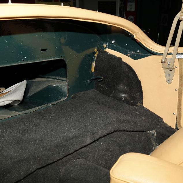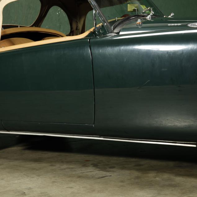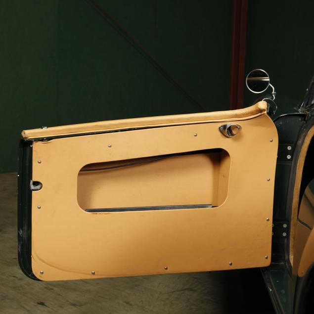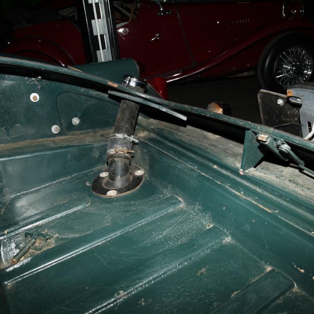 Exterior in British racing Green, with a new interior installed in Honey Tan leather seats. Black Carpets were installed with fasteners. The floor pans were replaced, as well as the "B" pillars and sills during the restoration. The chassis was treated with Waxoyl. A Nardi steering wheel was added, with the original remaining.
