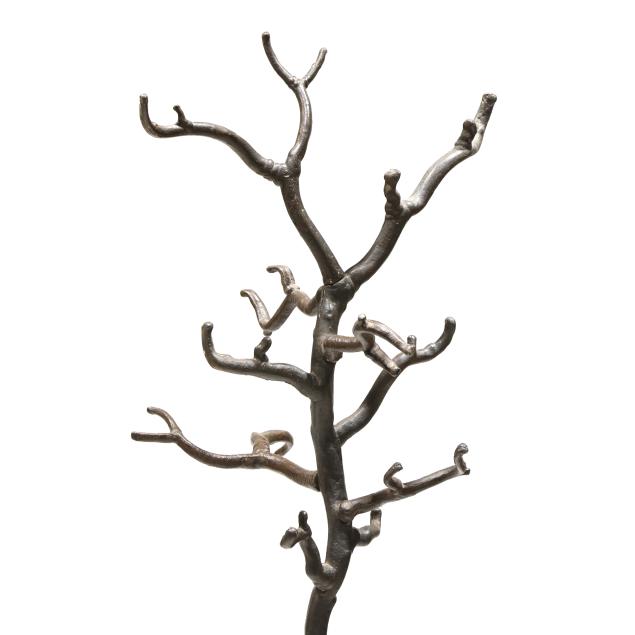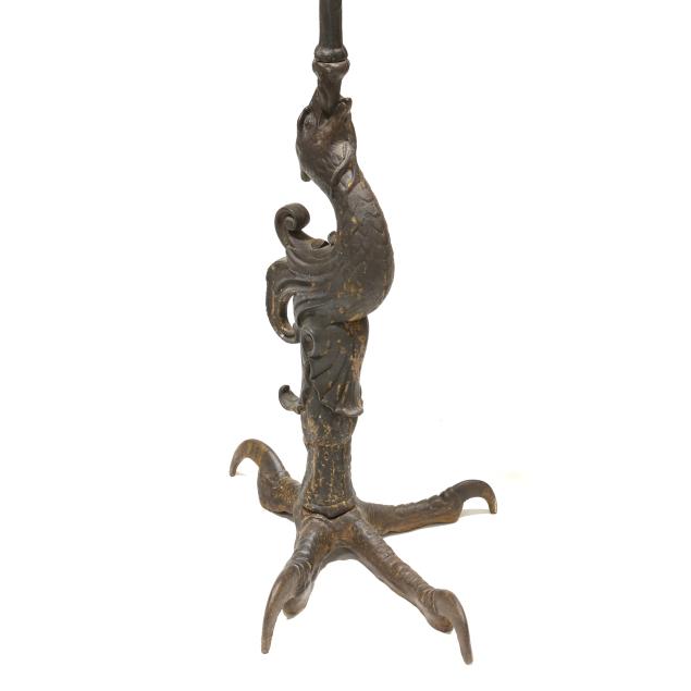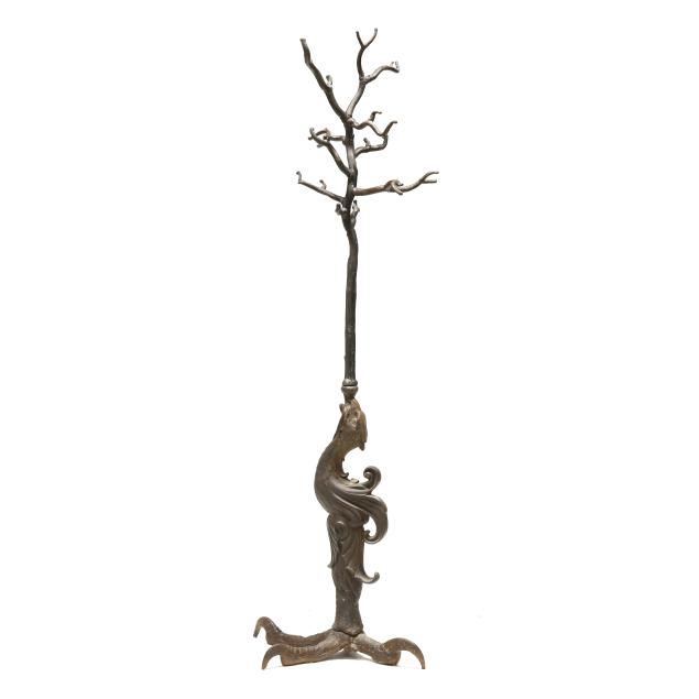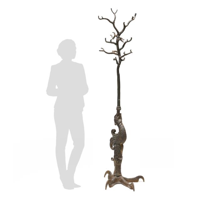 Second half 20th century, cast in multiple parts with threaded mounts in the form of a tree supported by a stylized rooster with single claw foot, appears unmarked.