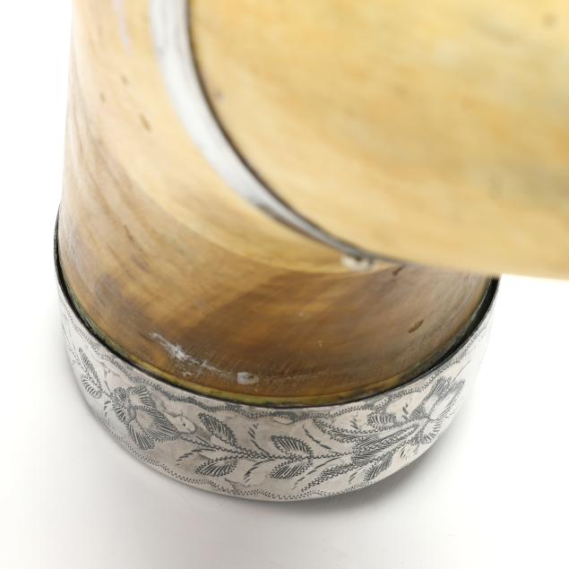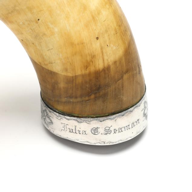 25 in. long natural bull horn, silver-plated strap mounts engraved with scalloped borders enveloping floral patterns, the distal end engraved "Julia C. Seaman", the proximal end with mouthpiece.