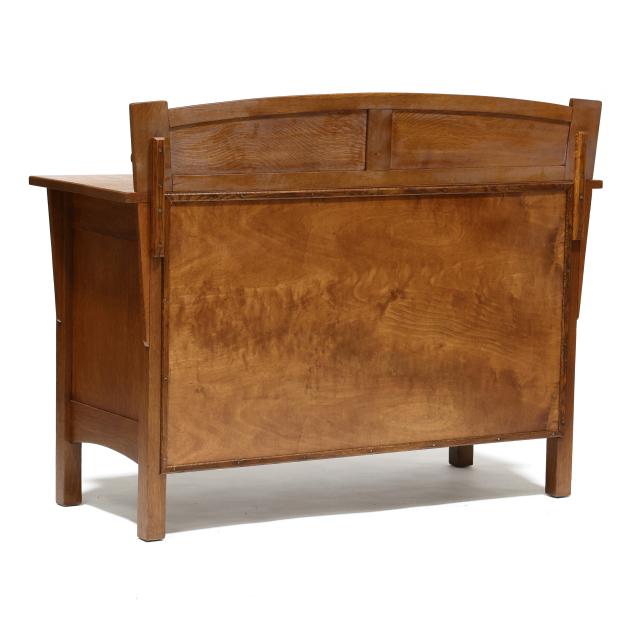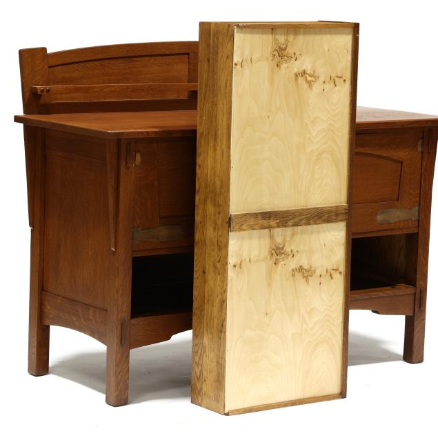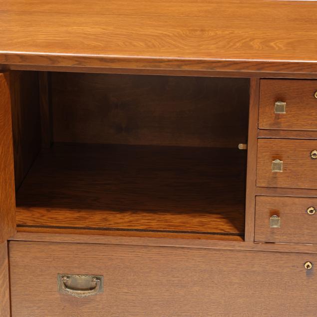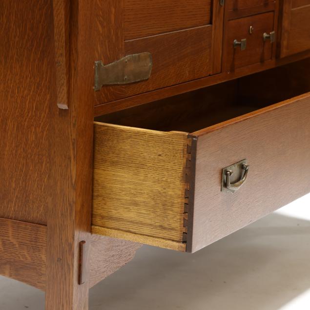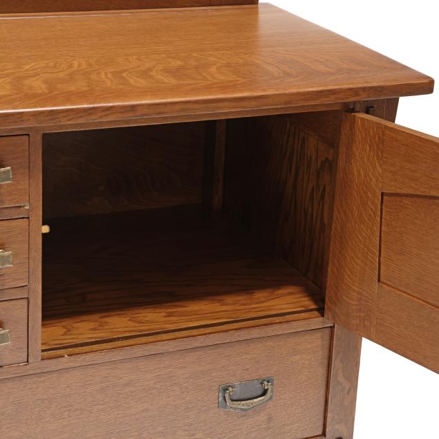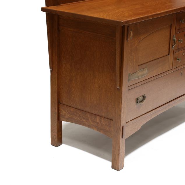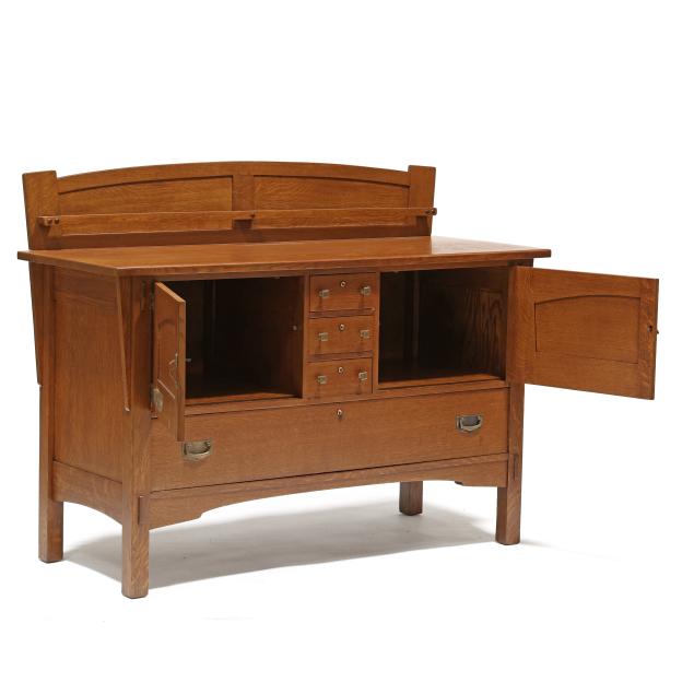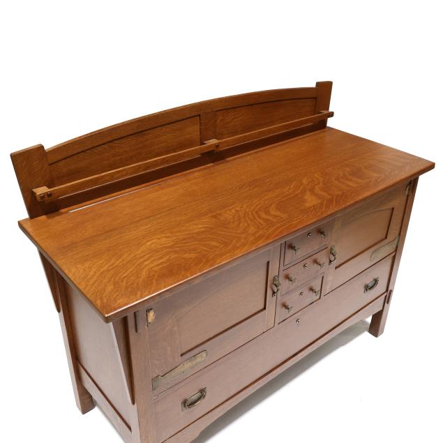 Early 20th century, quarter sawn oak, arched paneled backsplash with dish rail, the cabinet with four drawers and two hinged cabinet doors with hammered copper pulls and hinges, tapered returns, paneled sides, through tenon joinery, shaped arched skirt, straight legs, appears unmarked.