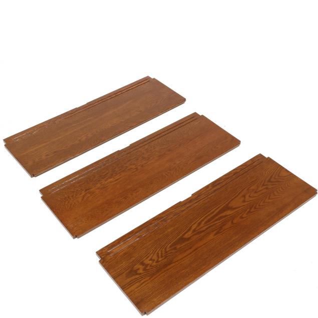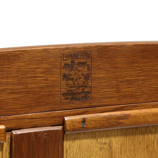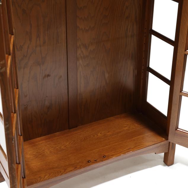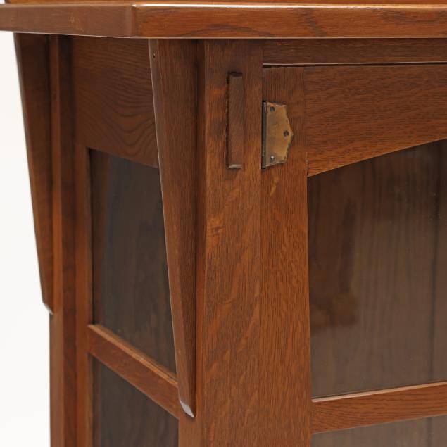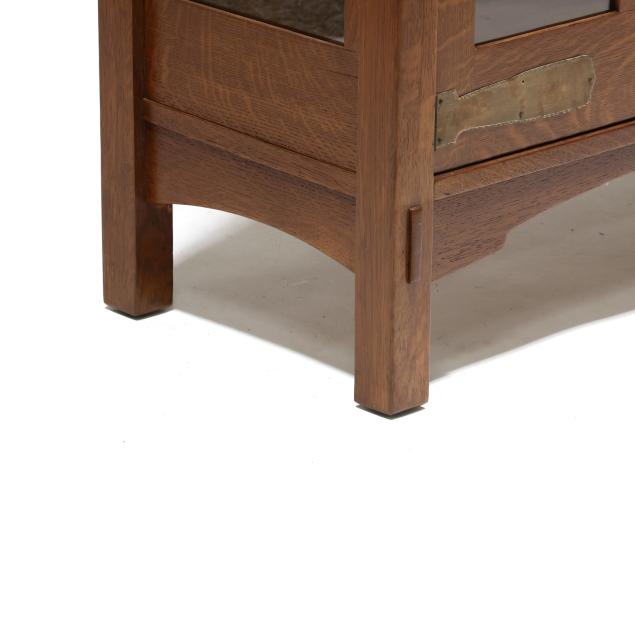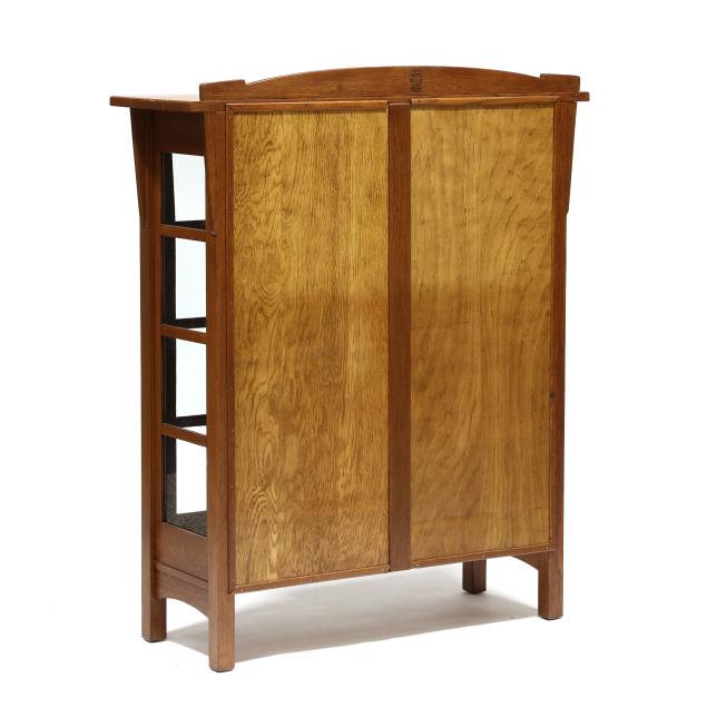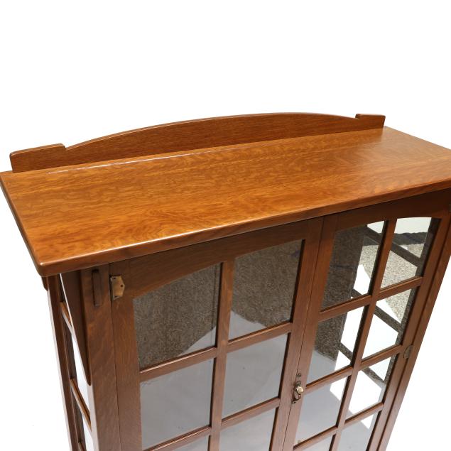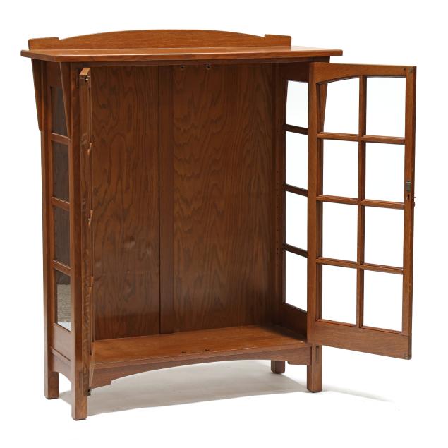 Early 20th century, quarter sawn oak, arched backsplash with dish rail, two hinged doors with eight window lights each, shelved interior, glass panel sides, through tenon joinery with tapered returns, hammered copper hardware, wood shelves, stamped to back.