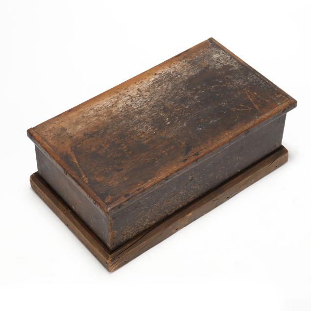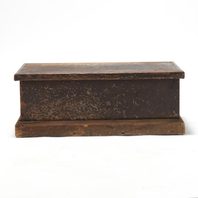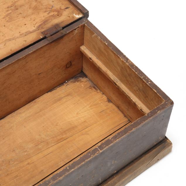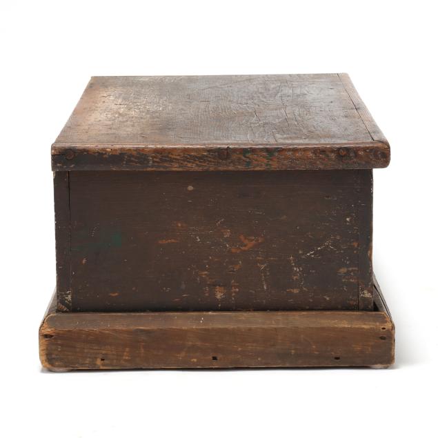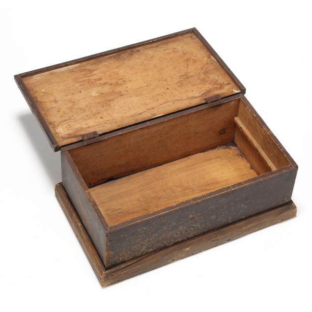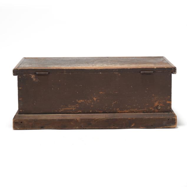 Early 20th century, white pine with dark wash, hinged lid with applied edge, interior with batten strips to the sides, applied molded flush base.