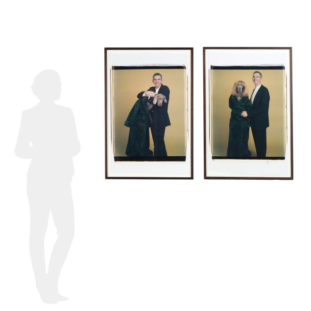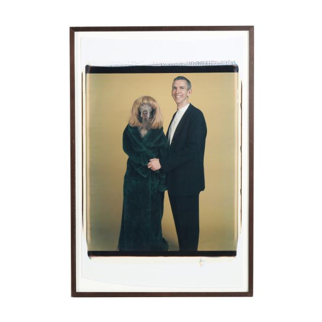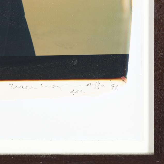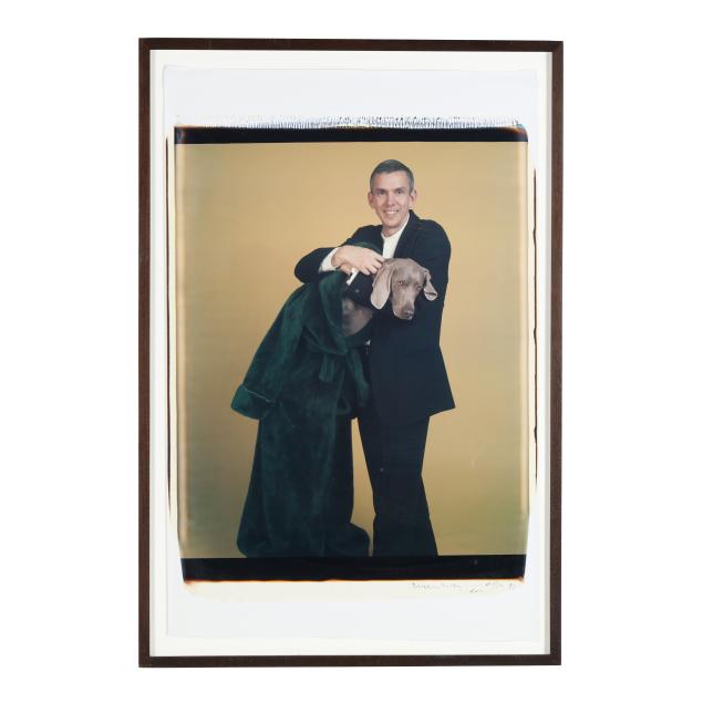 Private Collection, Raleigh, North Carolina In 1996, William Wegman participated in Maximum Exposure, a fundraising initiative organized by Photographers + Friends United Against AIDS in support of DIFFA (Design Industries Foundation Fighting AIDS). As one of several leading photographers involved, he contributed to a collaborative effort that paired artists with patrons to create unique photographic works. The project raised funds and awareness for AIDS research and care, alongside contributions from artists including Annie Leibovitz. One of Wegman's famous Weimaraners, Battina, is pictured here with a patron. Battina was the daughter of Fay Ray, the iconic subject of many Wegman photographs of the 80s and 90s.