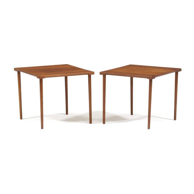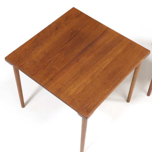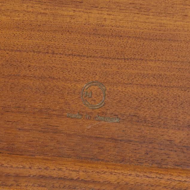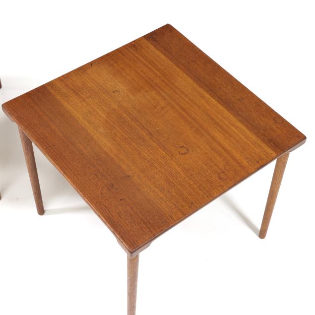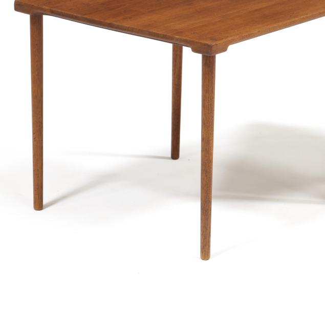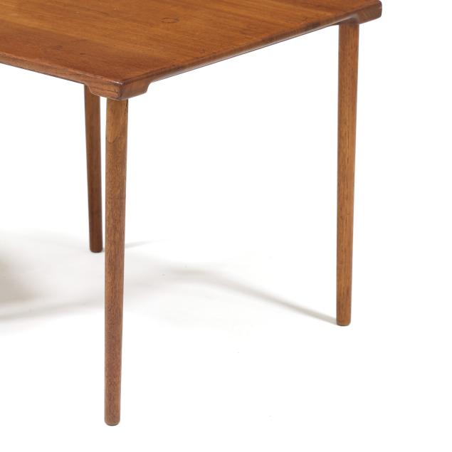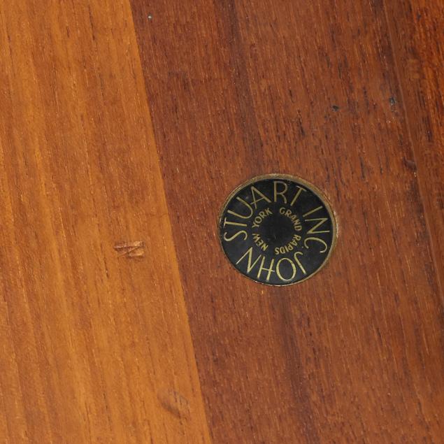 Circa 1960, for John Stewart, square top with underside notched edge, straight turned legs, marked.