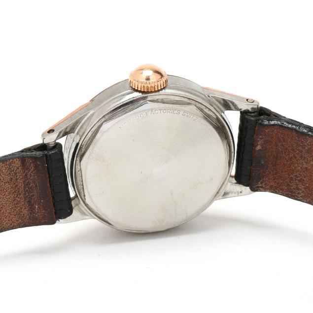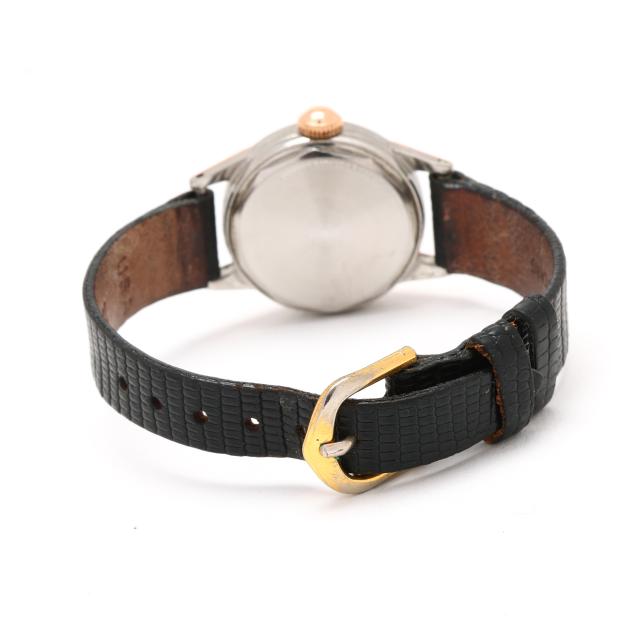 Manual wind, Movado 105, reference number 13310, serial number 131811, the round stainless steel case with polished rose gold-capped bezel and lugs, the silver and yellow dial signed Tiffany & Co. with rose-tone Arabic numeral hour markers, rose-tone stick hands, and outer minute register, the black lizard strap, marked USA / Genuine Lizard, completed with gold-tone buckle, the caseback signed Movado Factories.