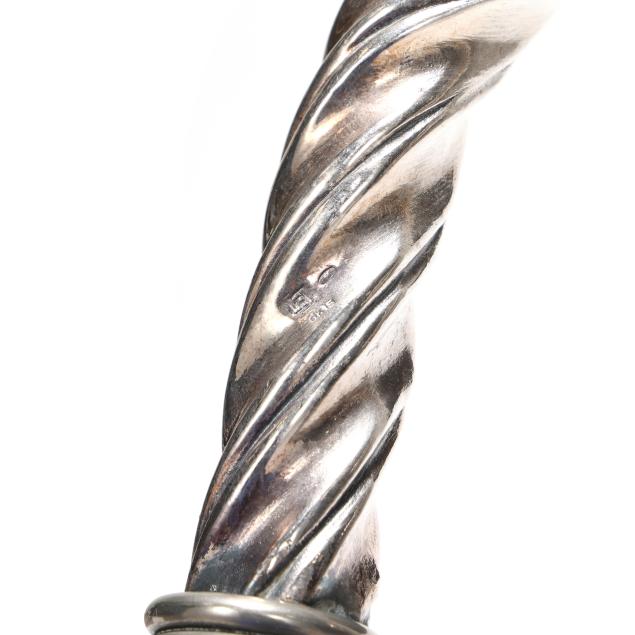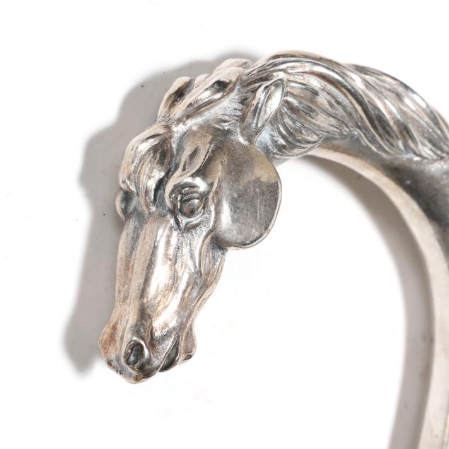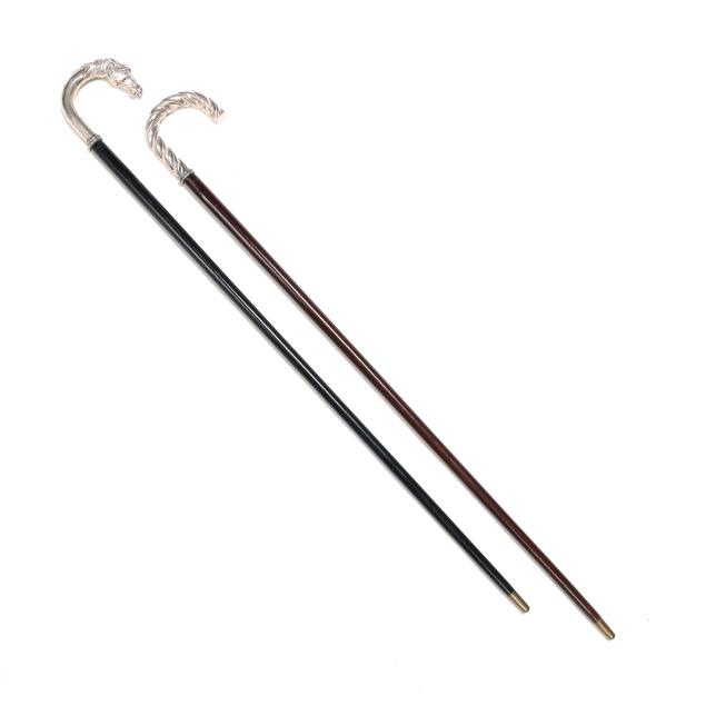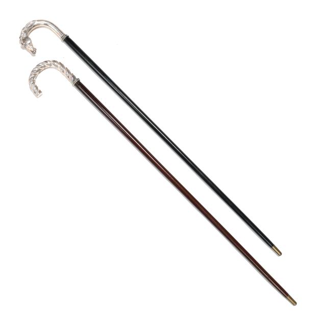 20th century, likely Italian, both stamped "925 [within an oval], "GR.15", with worn maker's mark, the first with twisting Baroque style crook handle, over a tapering mahogany shaft (38 1/2 x 5 x 1 1/4 in.); the second with horse head crook handle over an ebonized wood shaft (38 x 5 x 1 in.).