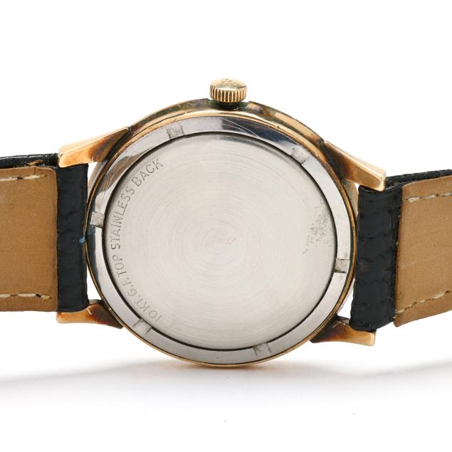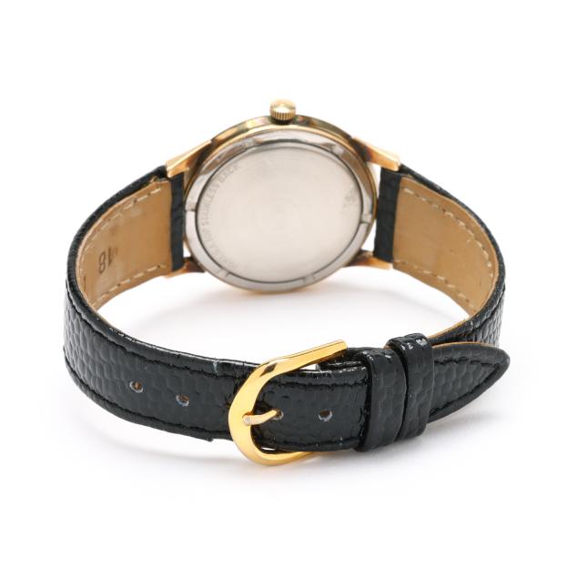 Manual wind, Wittnauer 11BG, reference number 103-G31X, serial number 293086, the round gold-filled case with polished bezel, the signed gold-tone dial with guilloché engraving, gold-tone Arabic numeral and arrow hour markers, gold-tone Dauphine hands, and subsidiary second dial at 6:00 hour, the textured black leather strap marked Lizo Calf, completed with a gold-tone buckle, the caseback marked 10KT.G.F.Top Stainless Back.