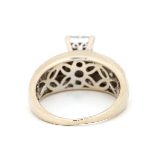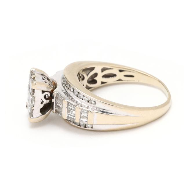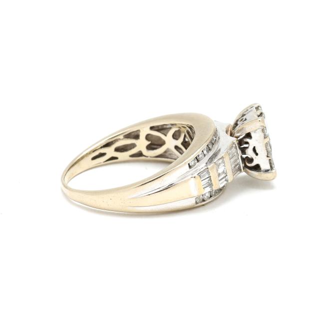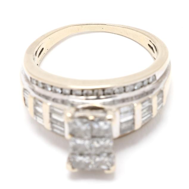 Set to the center with a cluster of princess cut diamonds weighing approximately .78 total carat (I-J color, I1 clarity), the shoulders and joined band with baguette cut and single cut diamonds weighing approximately .75 total carat (I-J color, I1-I3 clarity) and with yellow gold accenting band top and bottom borders, testing 14KT.