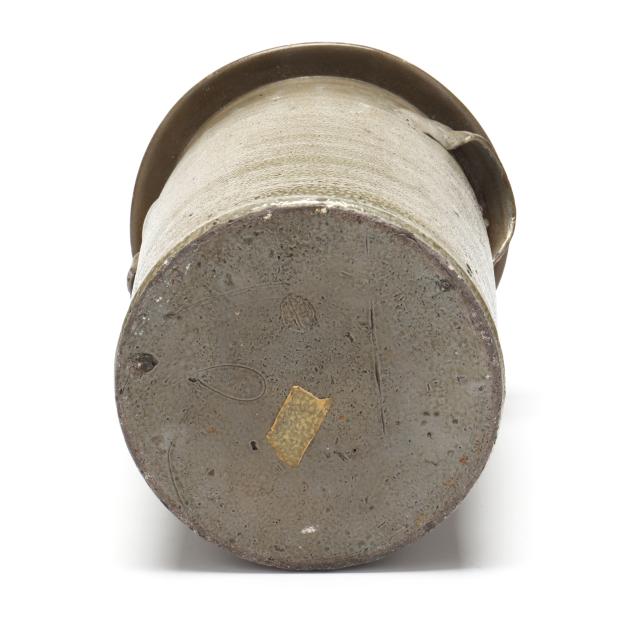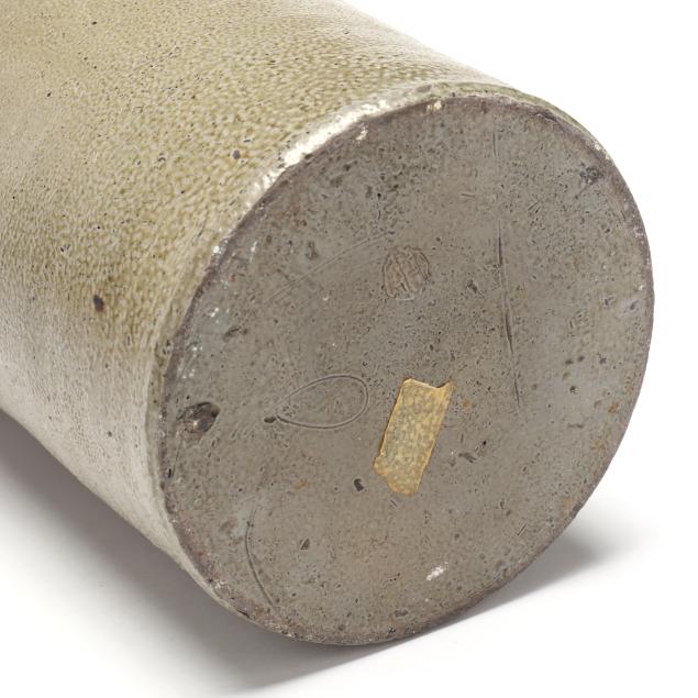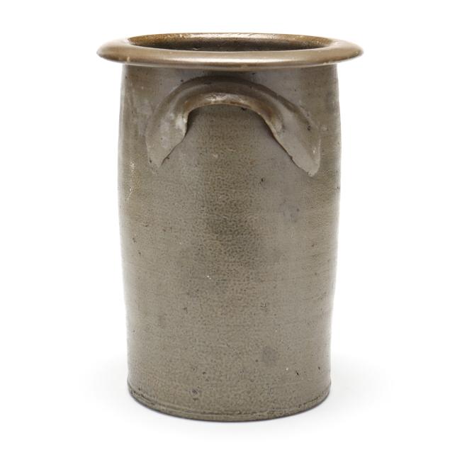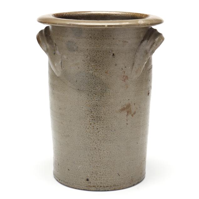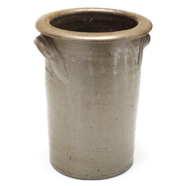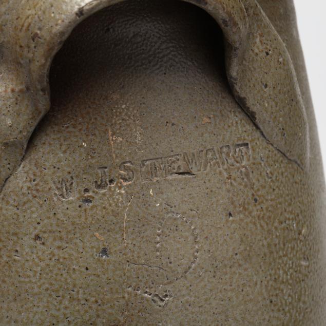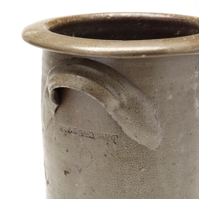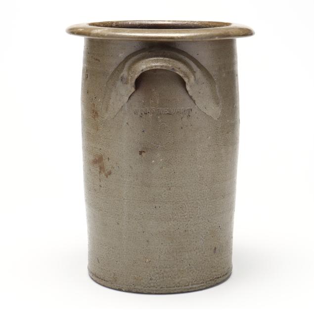 19th century, salt glazed stoneware with a flat rim above a cylindrical body with all over salt spotting, applied grooved arched ear handles, stamped below one handle "W.J. STEWART" above a coggle wheel "2" capacity mark.