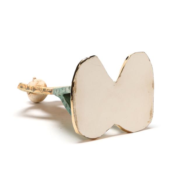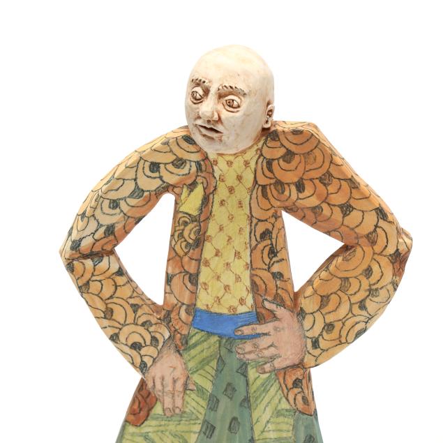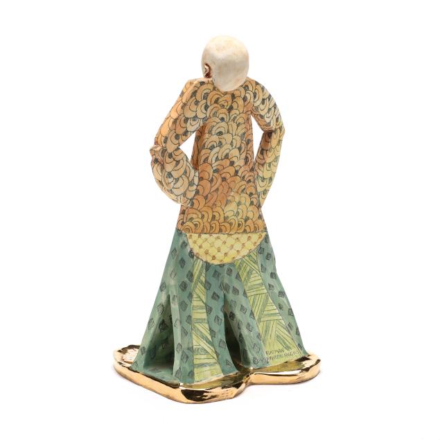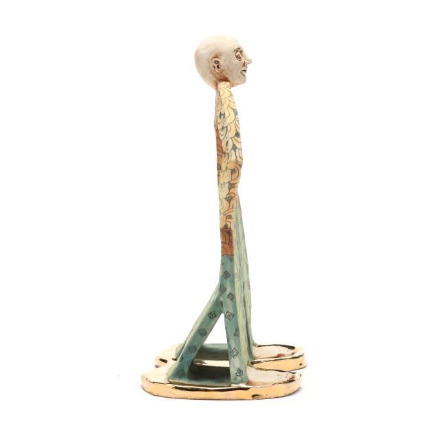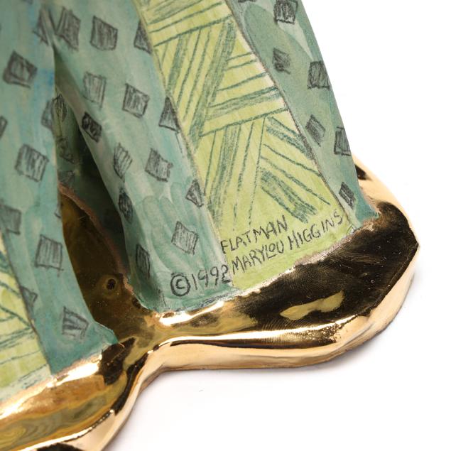 1992, hand-built and -painted ceramic standing man with gilt luster base, signed "FLATMAN / ©1992 MaryLou Higgins" to base of posterior right leg.