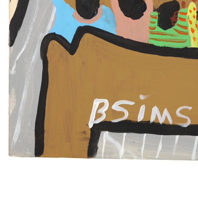 Bernice Sims was born in rural Alabama and resided there her entire life. It was not until she decided to enroll in community college, after raising six children, that she was encouraged by a professor to paint. Her works are characterized by bright colors, renderings of childhood memories, and, as she grew older, focused on the social and racial injustice amidst the Civil Rights Movement of the 1960s. In 2005, her work depicting the Edmund Pettus Bridge in Selma, AL, was issued on a postage stamp to commemorate the 40th anniversary of the Voting Rights Act.