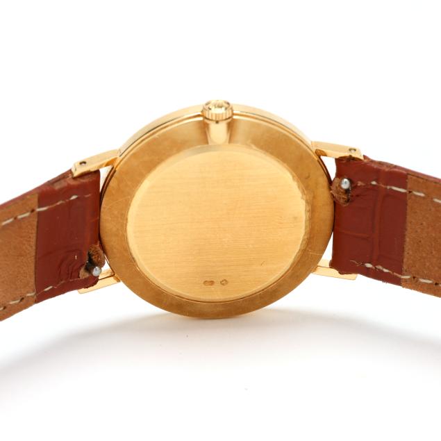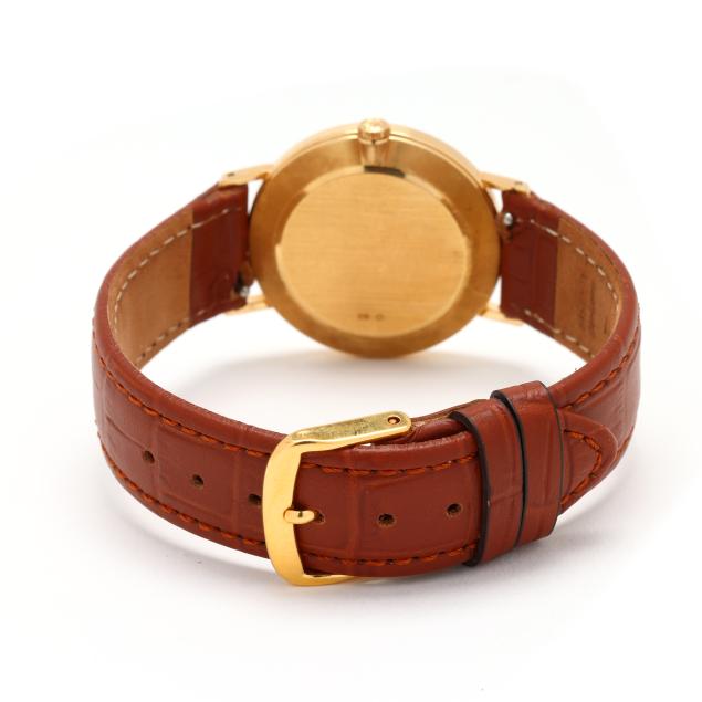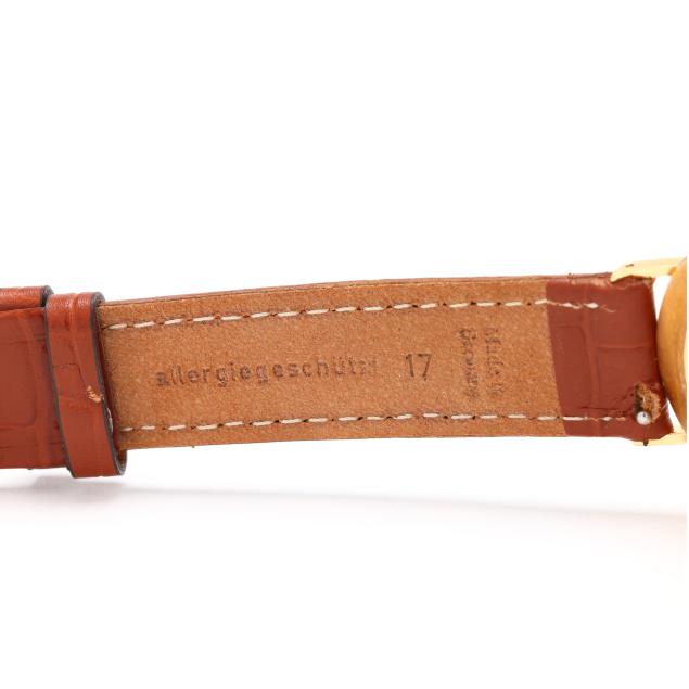 Circa 1995, manual wind, Rolex 1602, reference number 4112, serial number W050095, the round gold case with polished bezel, the signed champagne dial with gold Roman numeral hour markers and gold baton hands, the textured brown leather strap stamped allergiegeschützt / made in Germany, completed with a gold-tone buckle, the caseback numbered and stamped with Swiss hallmarks for 18KT.