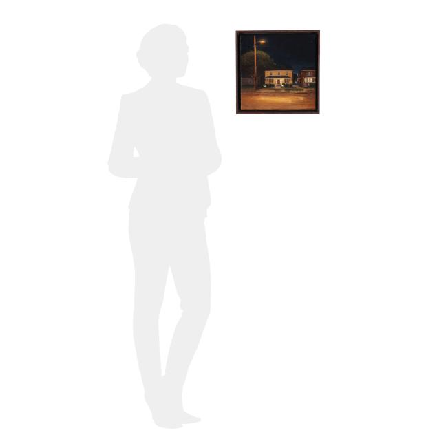 His process begins with the meticulous construction of miniature sets, hand-built models that serve as the physical references for his luminous oil paintings. The resulting works evoke the manicured optimism of 1950s suburbia while probing its shadows: the fragility of the American Dream, the quiet menace beneath its surface, and the deep alienation that can accompany the longing to belong.