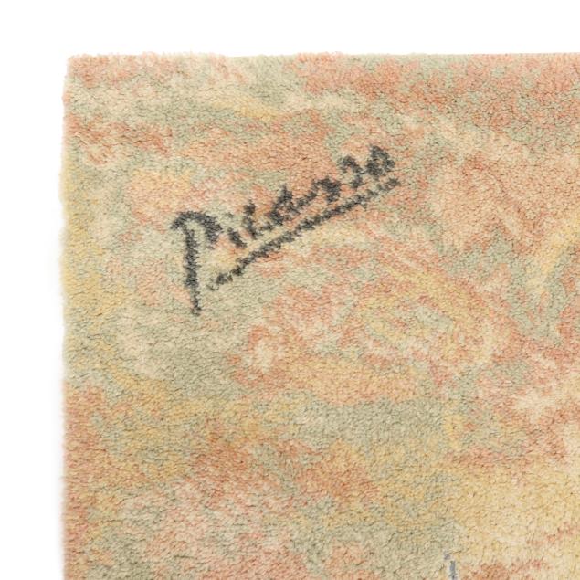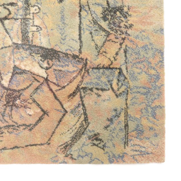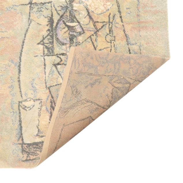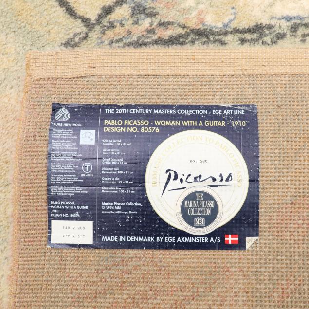 Wool on jute/polypropylene foundation, Denmark, 1994, featuring Picasso's "Woman with Guitar - 1910" in black over a ground of pastel earth tones, the edges hemmed under, label to verso from Ege Axminster indicates this is number 580 in the edition.