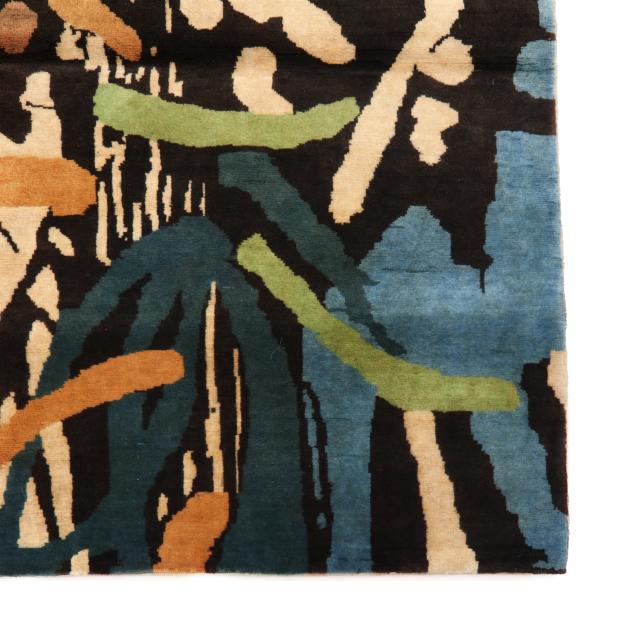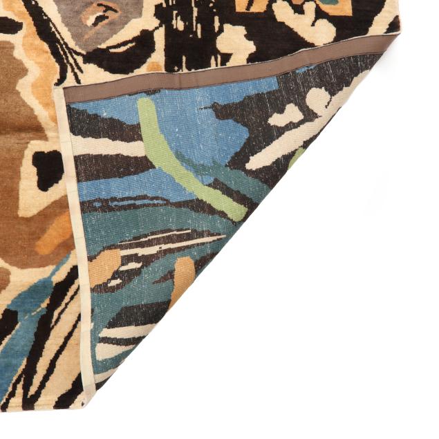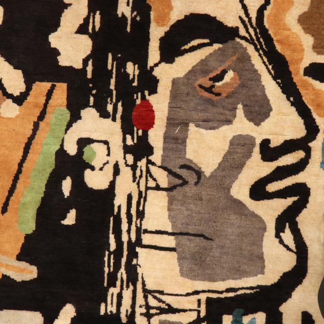 Wool on cotton foundation, with abstract imagery featuring multiple faces in blue, black, browns, green, and red on cream ground, ends hemmed to back, unlabeled.