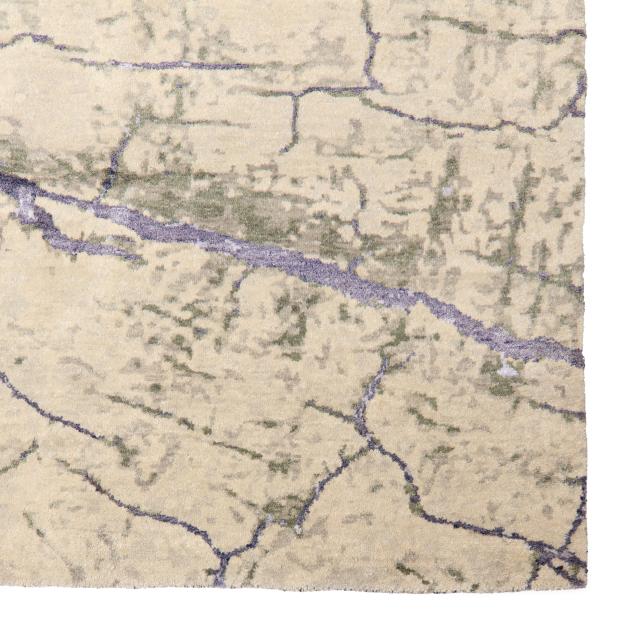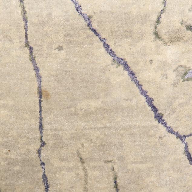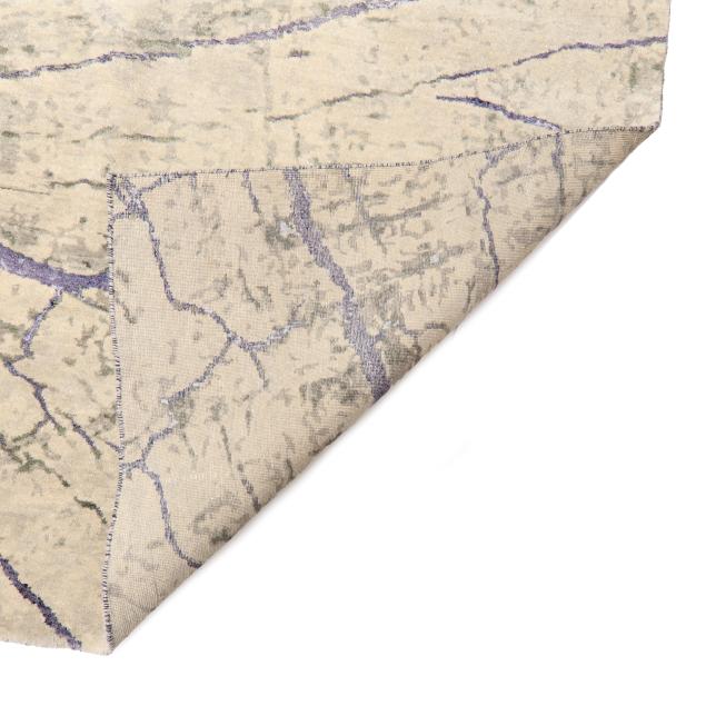Silk and wool on cotton foundation, India or Nepal, the silvery field with lavender blue highlights depicting a large scale impression of a tree cross-section, retailed by Due Process Stable Trading Company as part of their Landscape Collection.