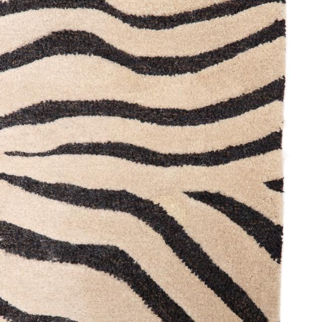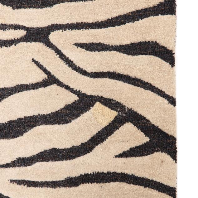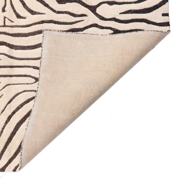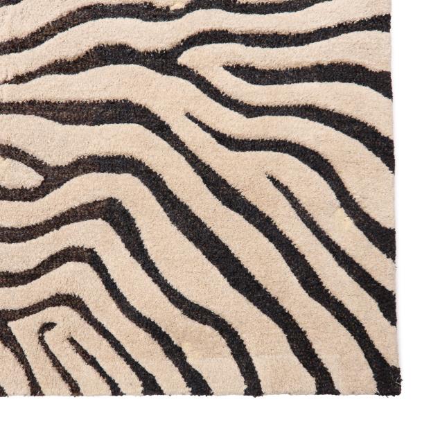 Wool on cotton foundation, India, in a zebra print design of black stripes on a cream ground, label to verso from Trans-Ocean.
