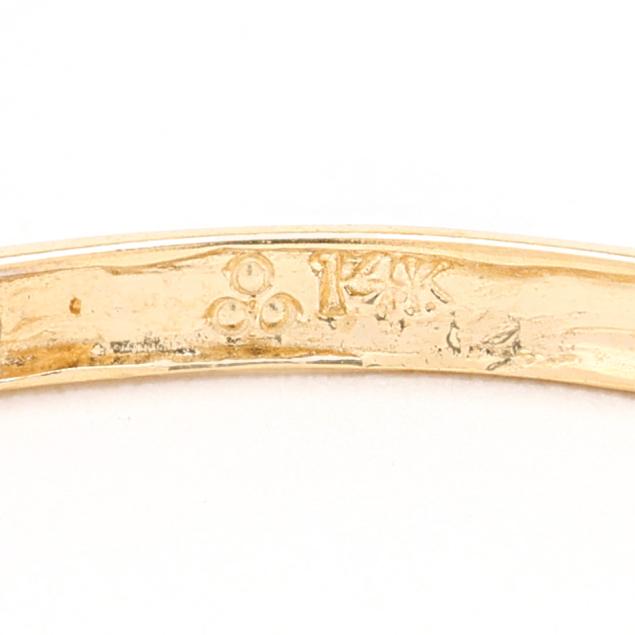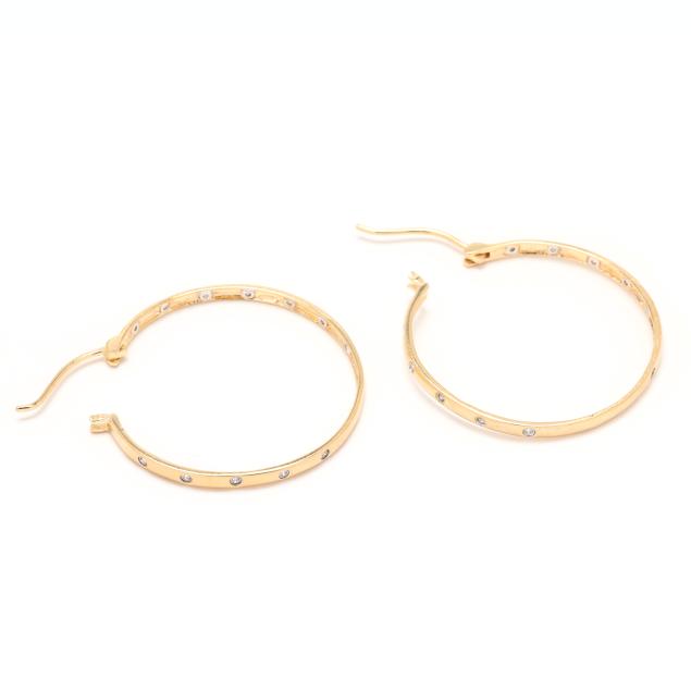 Pair of brushed gold hoops, flush set with full cut round diamond melee, completed with posts, stamped 14K and with a maker's mark.