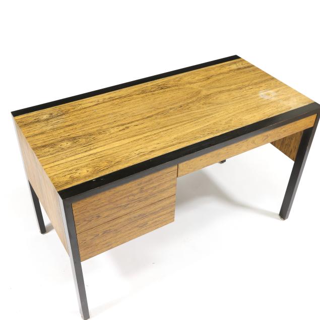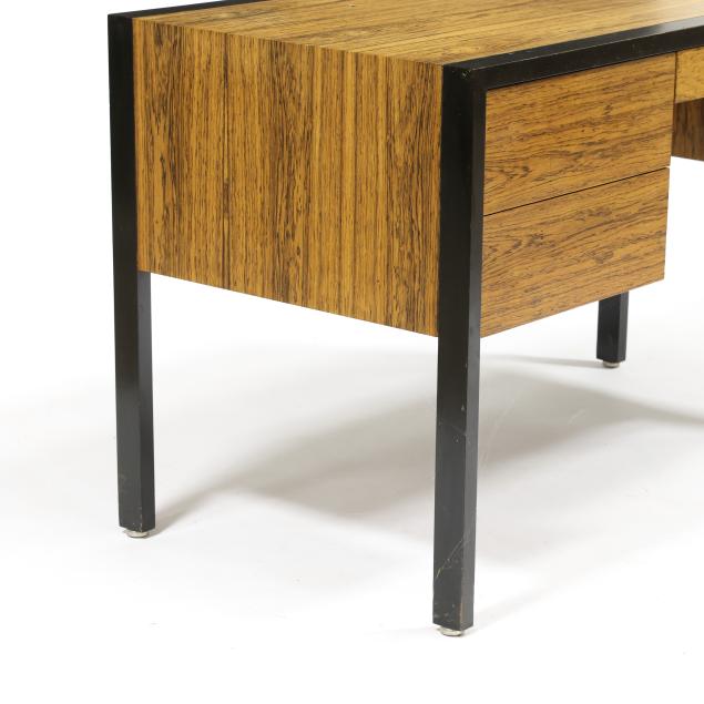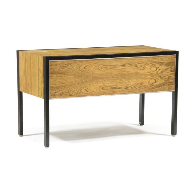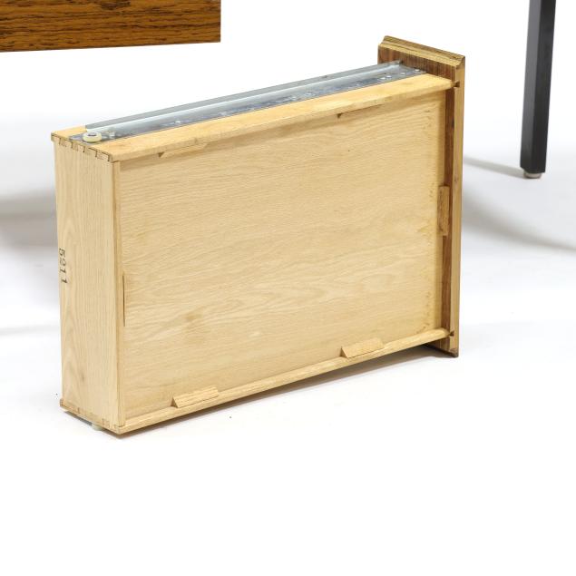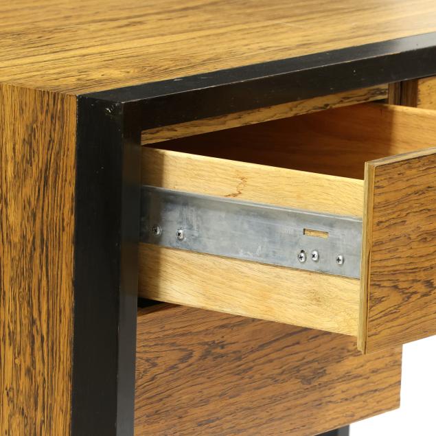 Circa 1960, for Harvey Probber, rosewood veneer with ebonized trim, three drawers, labeled, finished on all sides.