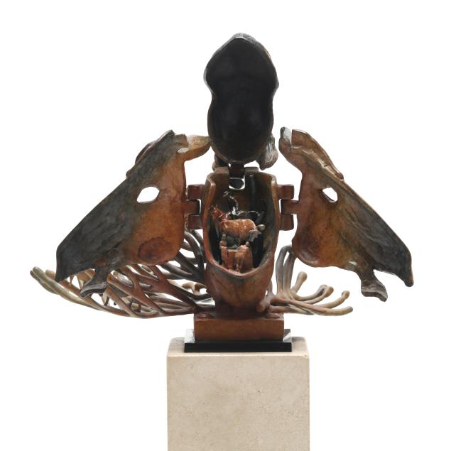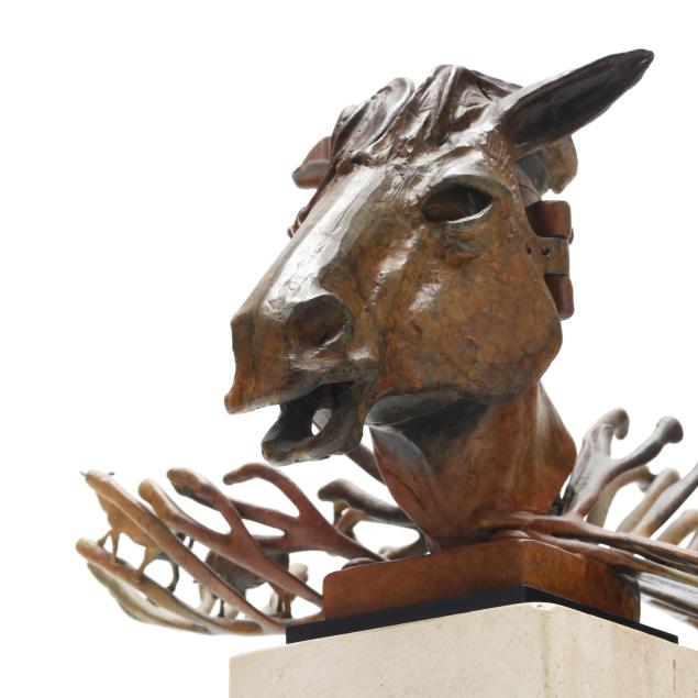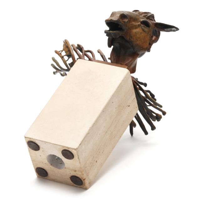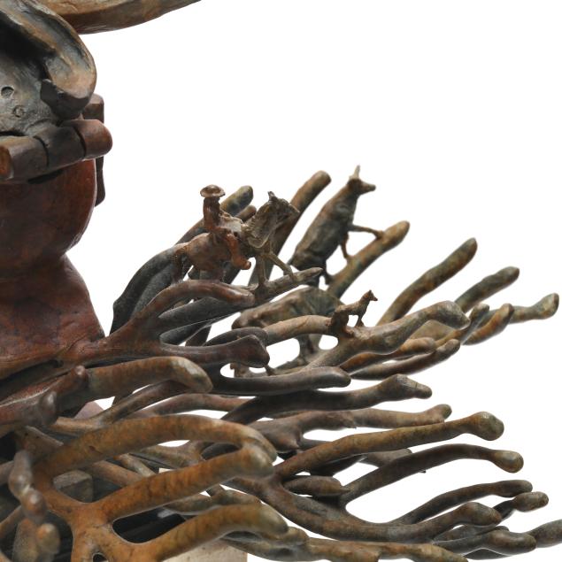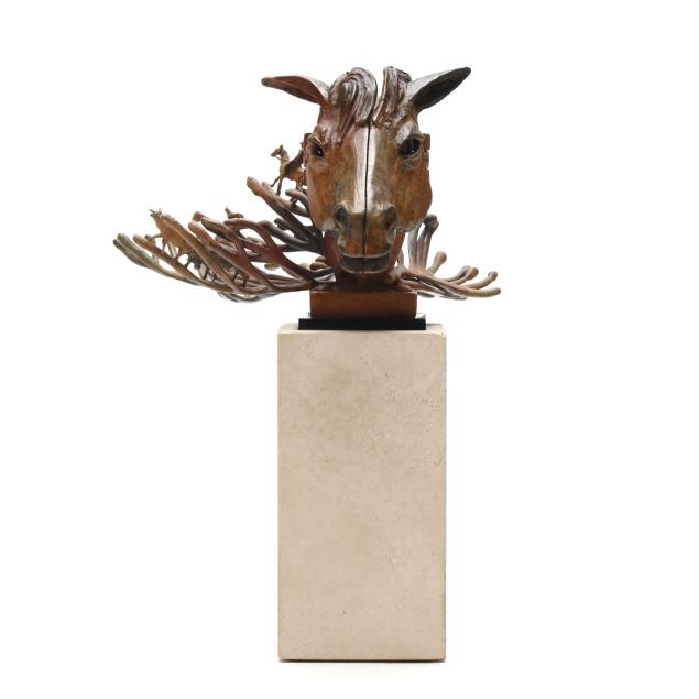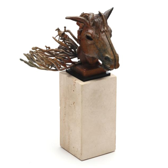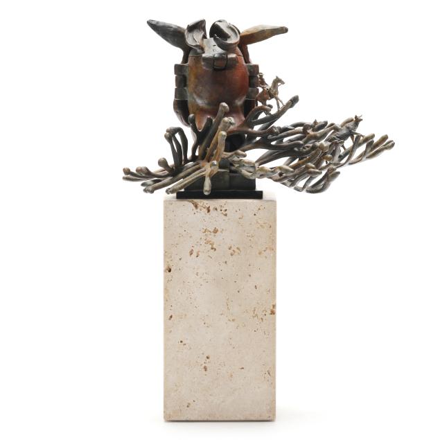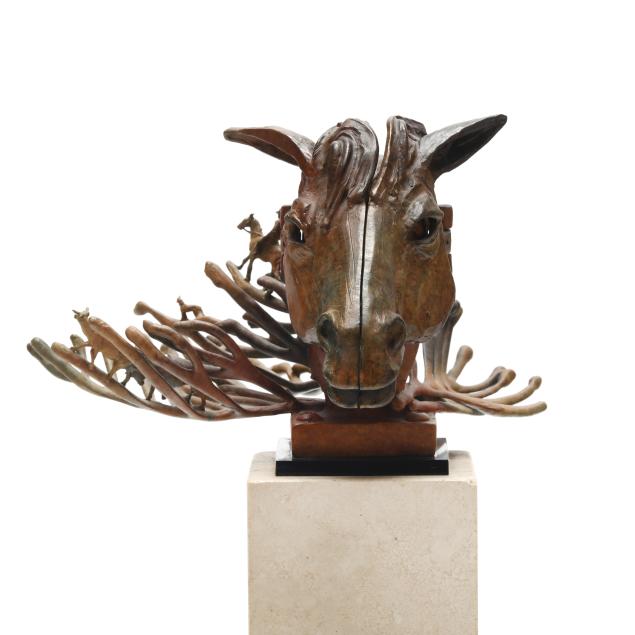 Circa 2011, unique work (not part of an edition), patinated bronze and travertine, signed "T. Gall" to the side, metamorphic hinged form of a horse head opening horizontally to reveal a man's face, the face lifts vertically to unveil a dreamlike Western equestrian scene, the posterior issuing coral branch and further thematic figural representation, mounted to an acrylic terrace and travertine plinth.