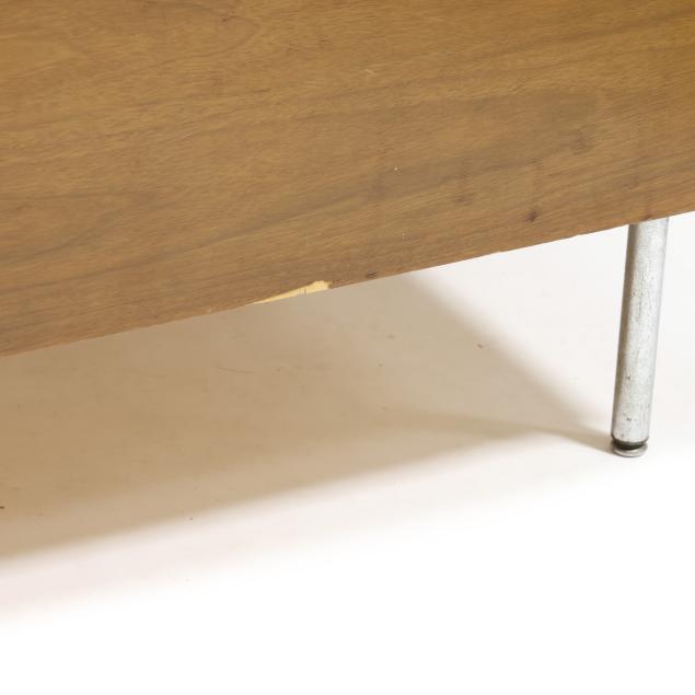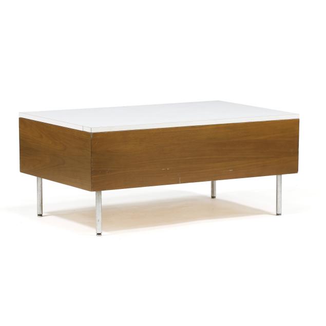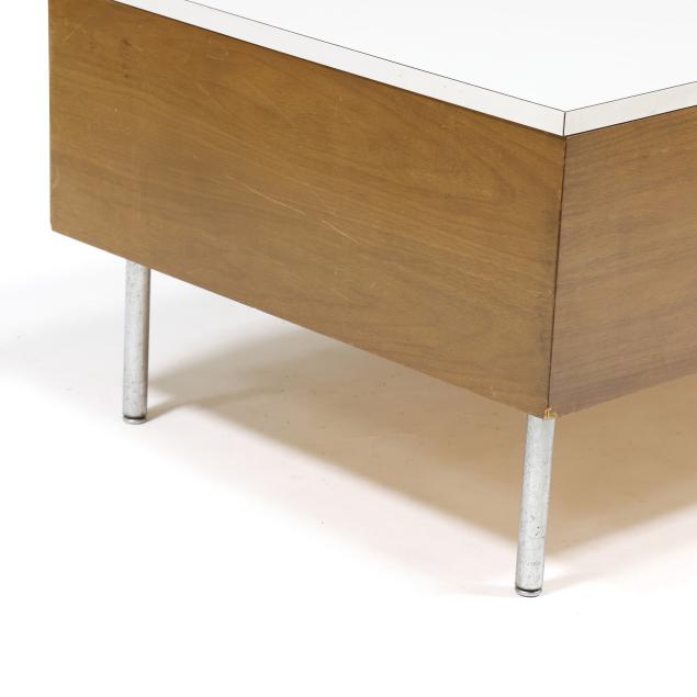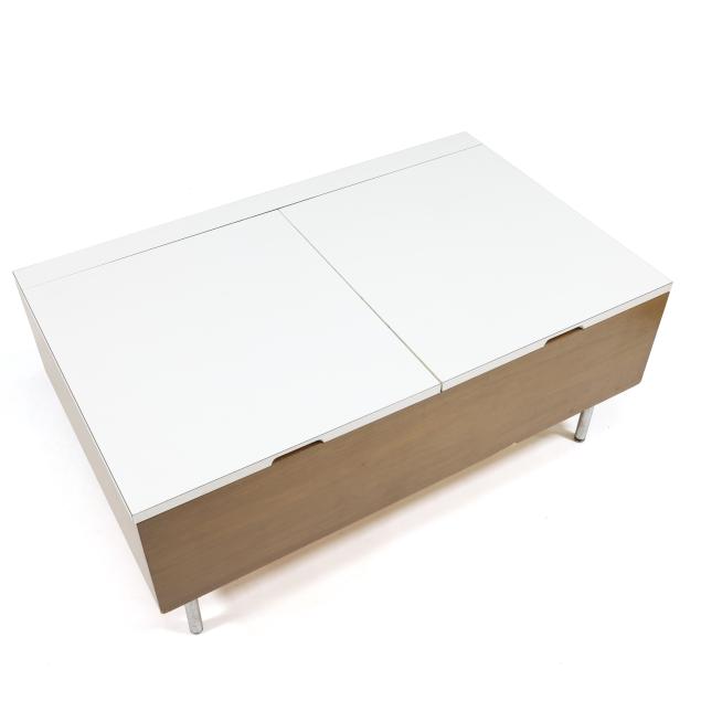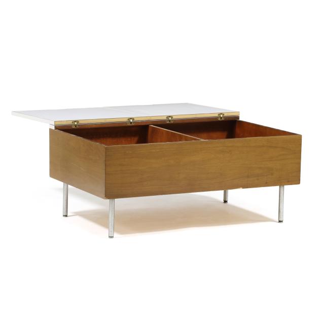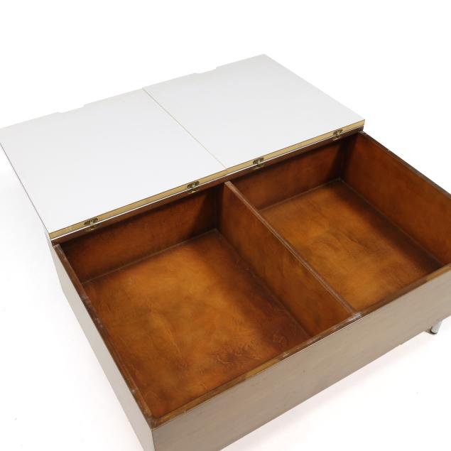Circa 1960, white laminate top with two hinged lids, divided interior, walnut veneer case on brushed steel legs, unmarked.