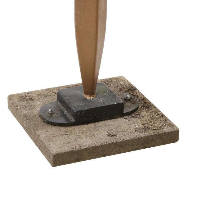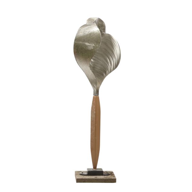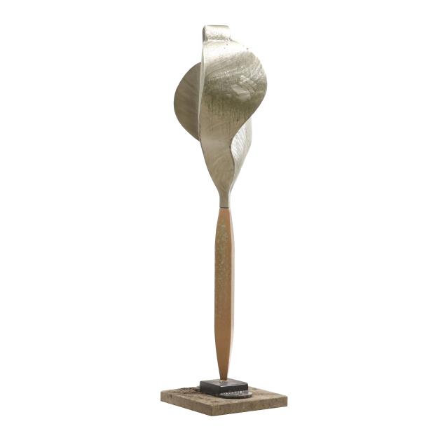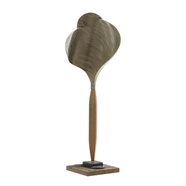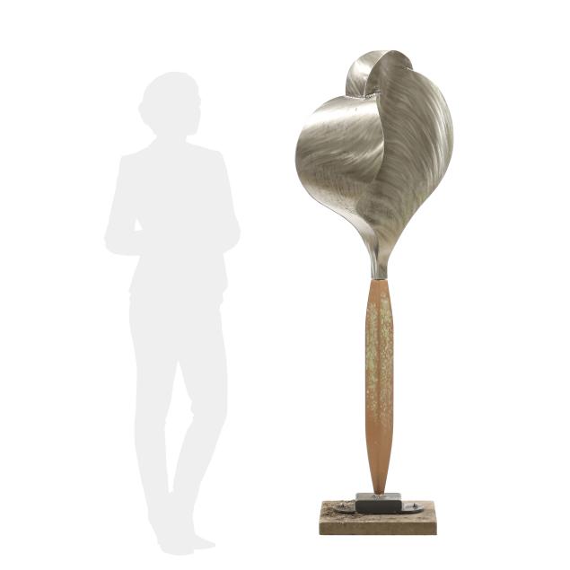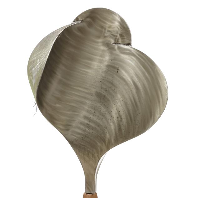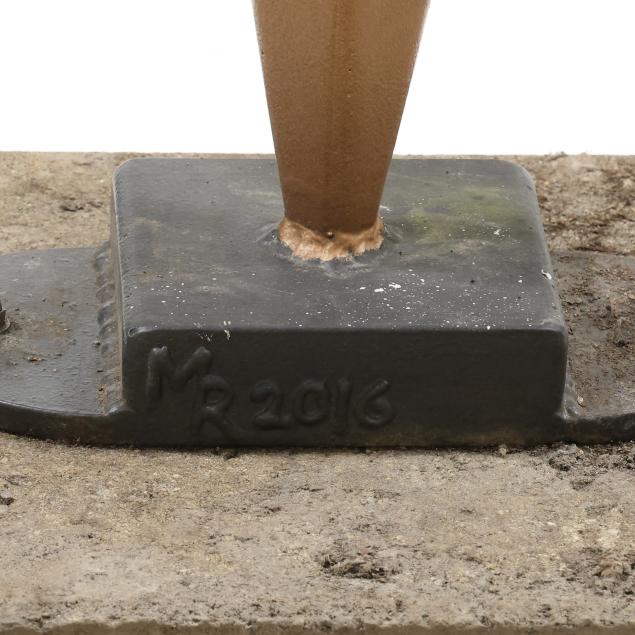 Carrboro, 2016, patinated metal with rotating brushed stainless cloud form steel top, signed and dated to the base mount, retaining ground anchor.