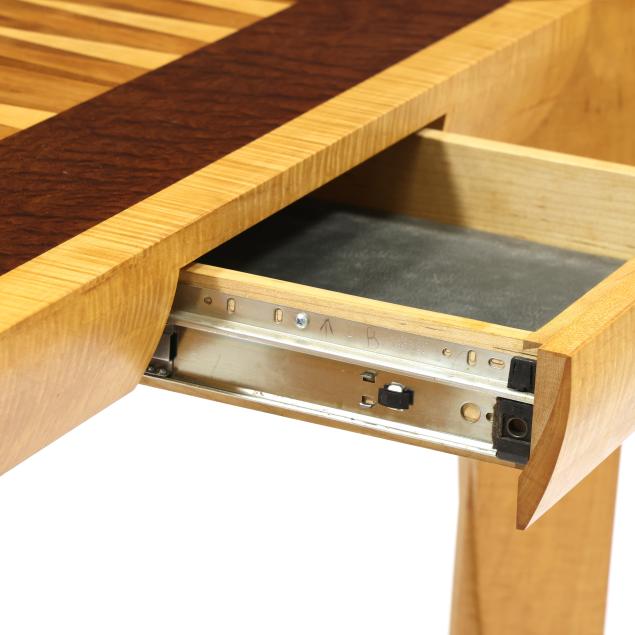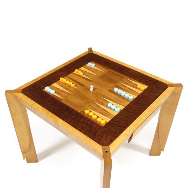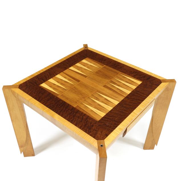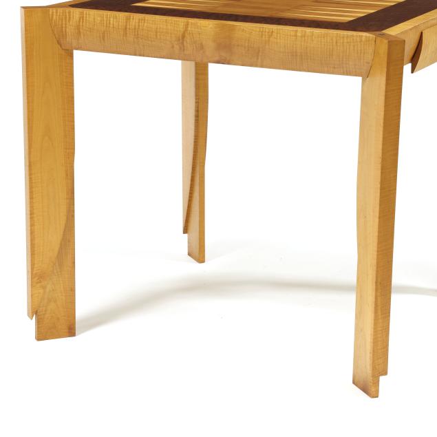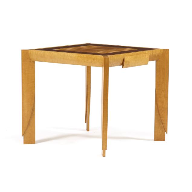 Late 20th century, curly maple, walnut and mixed woods, inlaid top, two drawers, with hand made glass playing pieces, marked to underside.