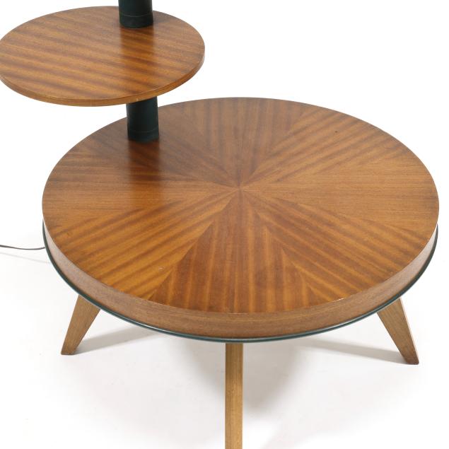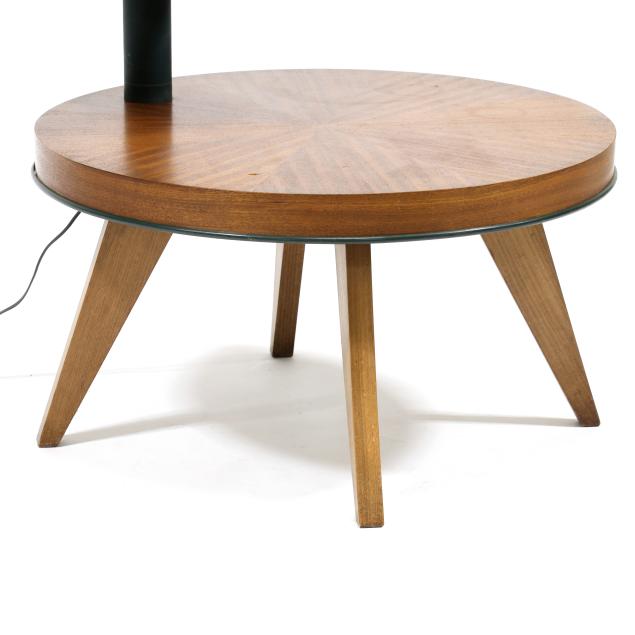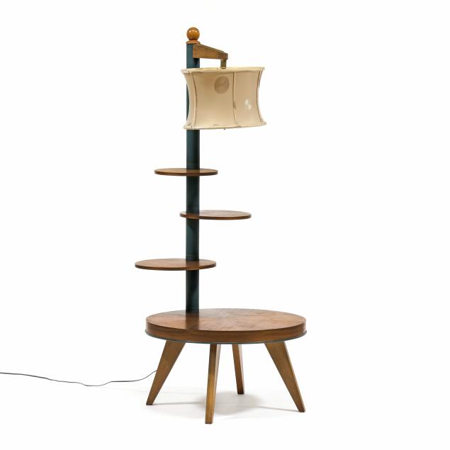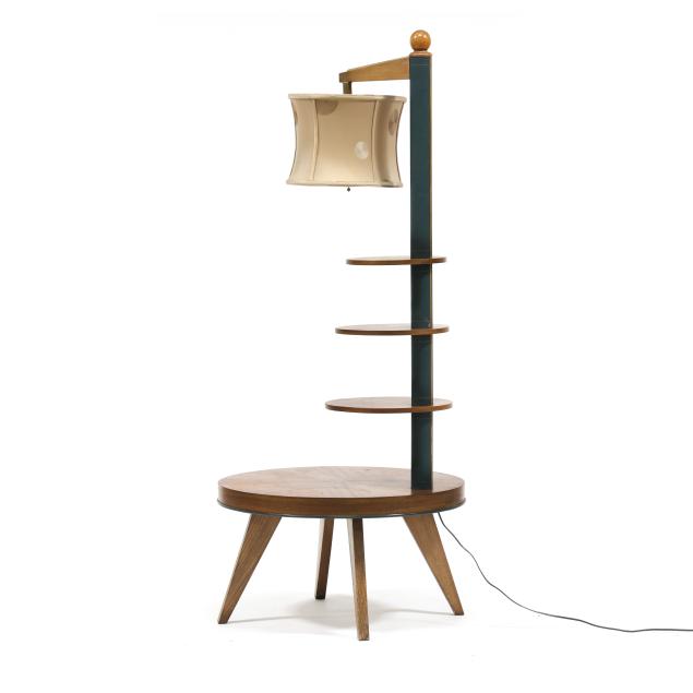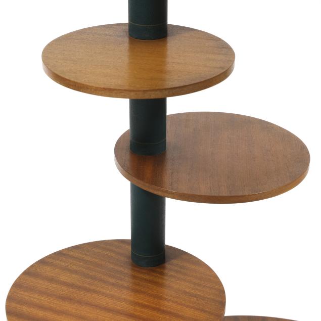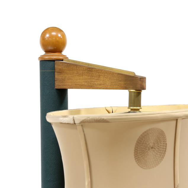 France, circa 1950, mahogany veneer, green leather wrapped standard, three upper adjustable shelves, splayed legs, unmarked.