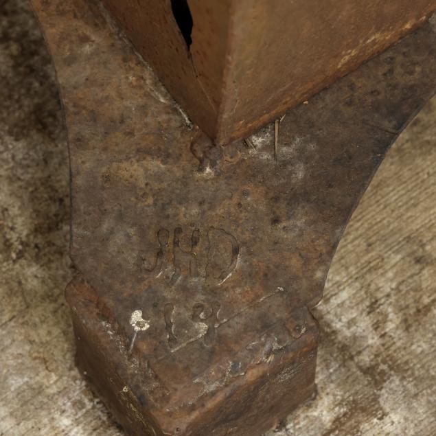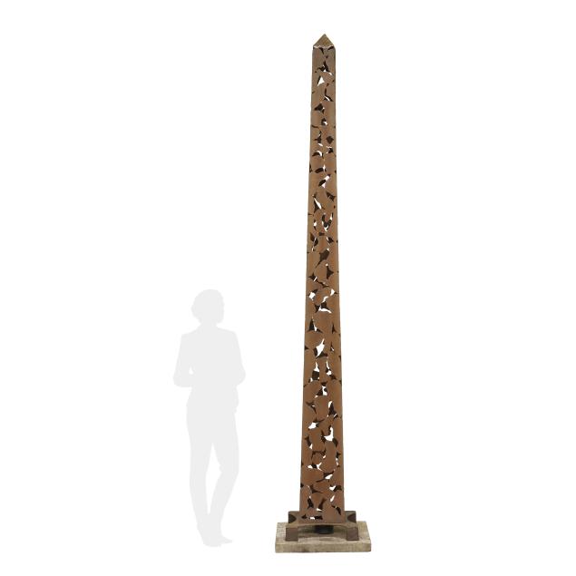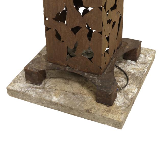 2014, fabricated and welded steel, signed and dated to the base plate, mounted atop a square concrete base. Included with this Lot is a light to the base with associated electrical components (not tested, as found condition).