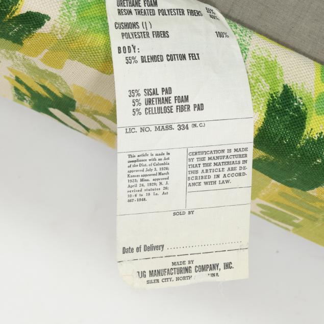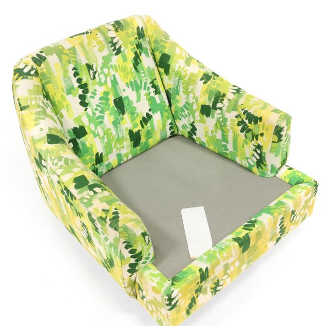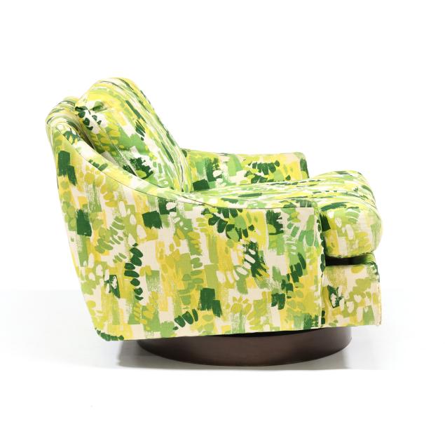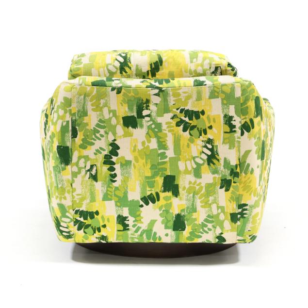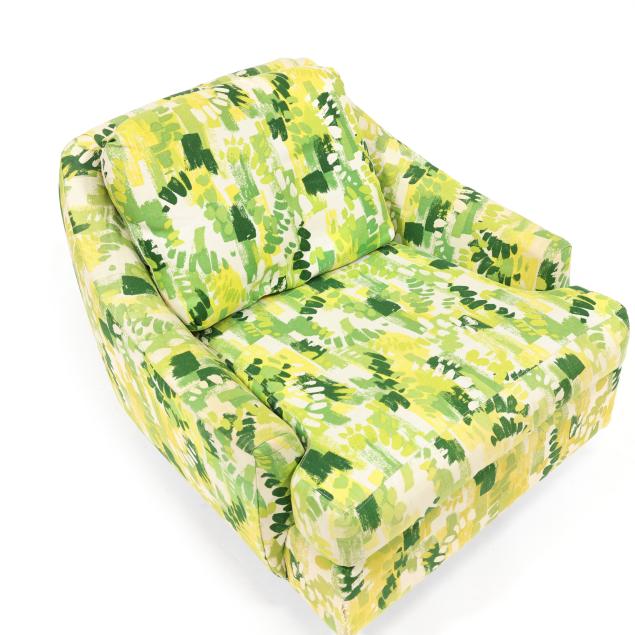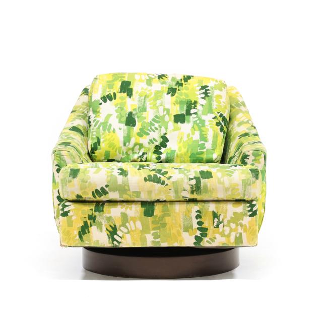 Selig, circa 1960, likely original green/yellow/white printed upholstery, loose back and seat cushion, swivel seat with spring rocking mechanism, labeled.