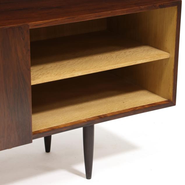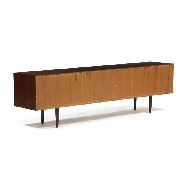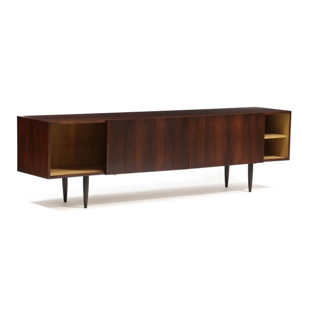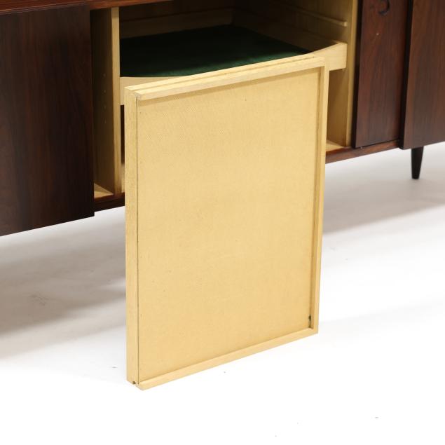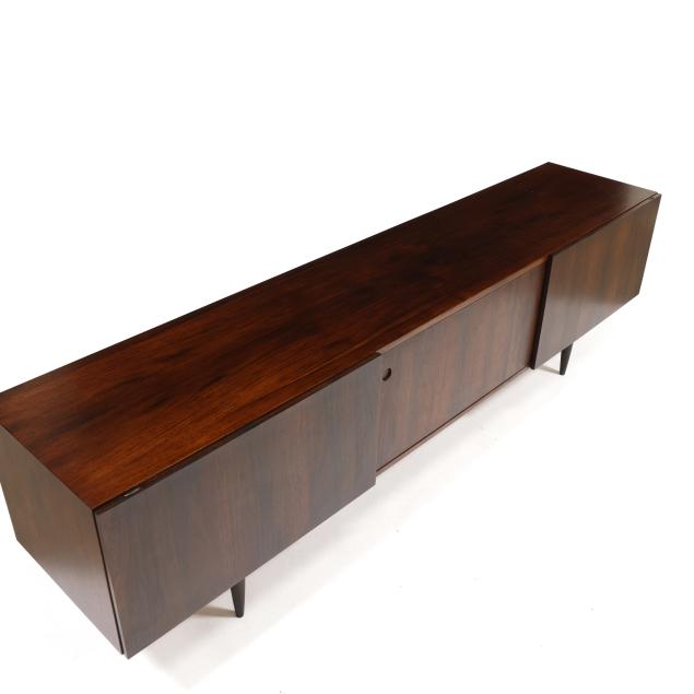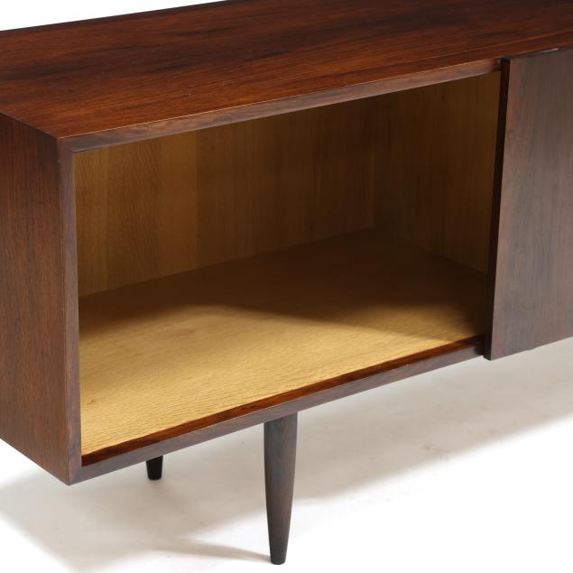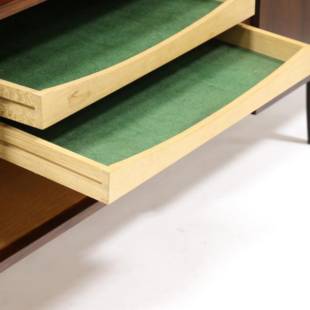Circa 1960, rosewood veneer, low profile form with three sliding panel doors, divided interior with two fitted drawers, turned tapered legs, unmarked.