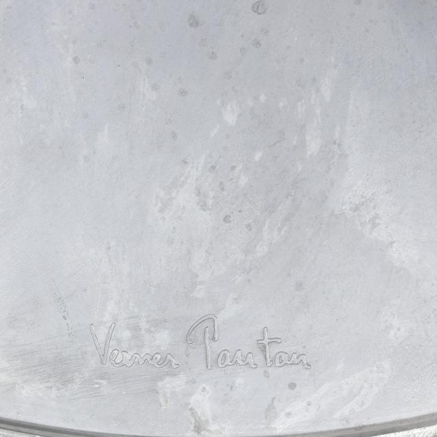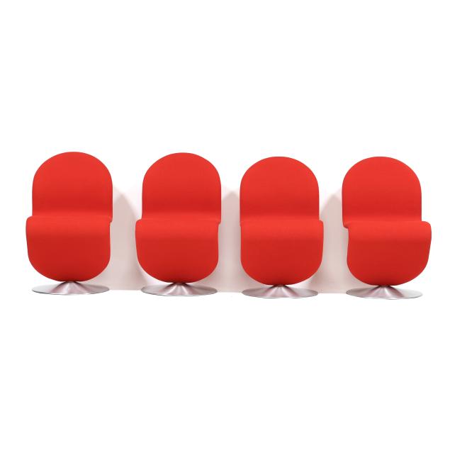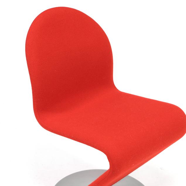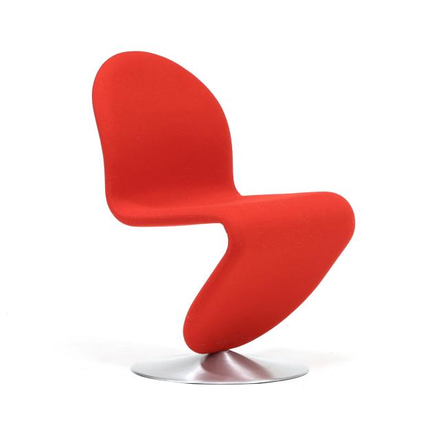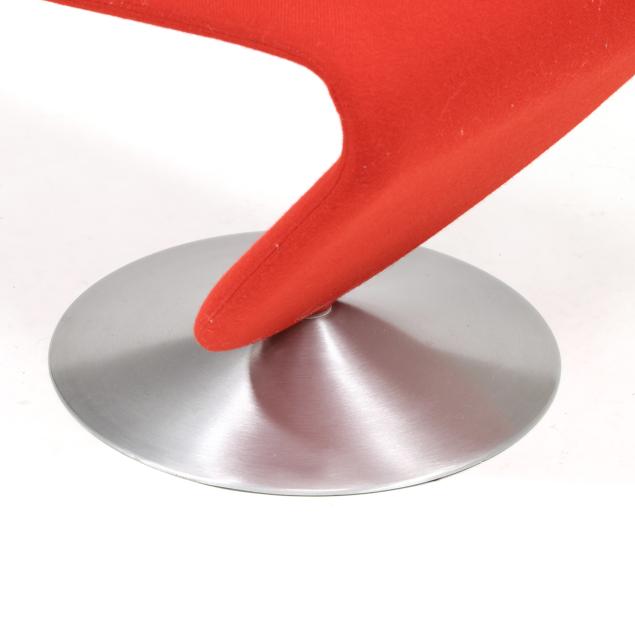 Late-20th-century production, red upholstery, swivel brushed aluminum base, labeled.