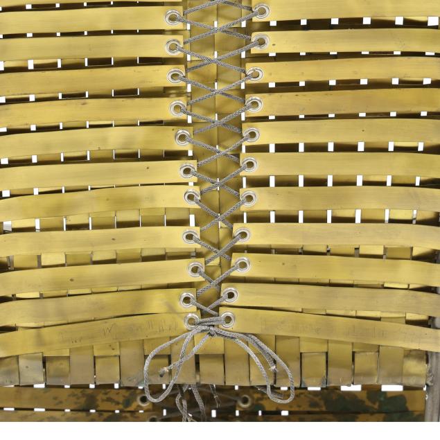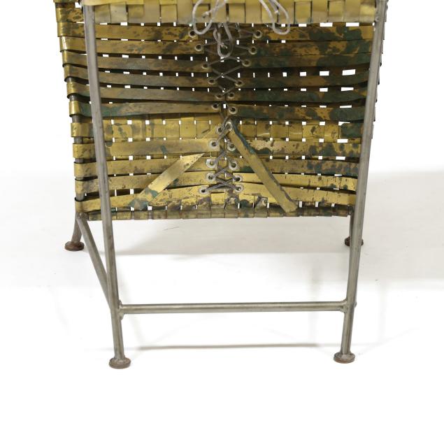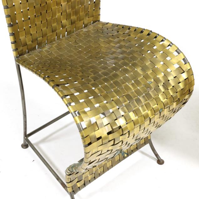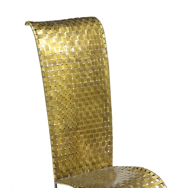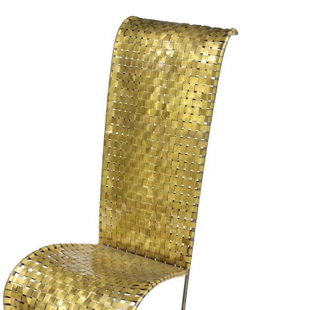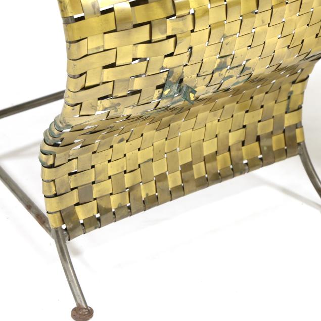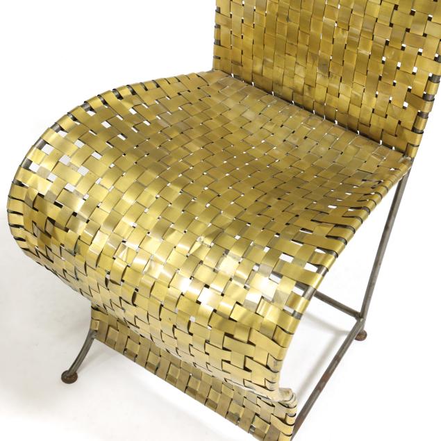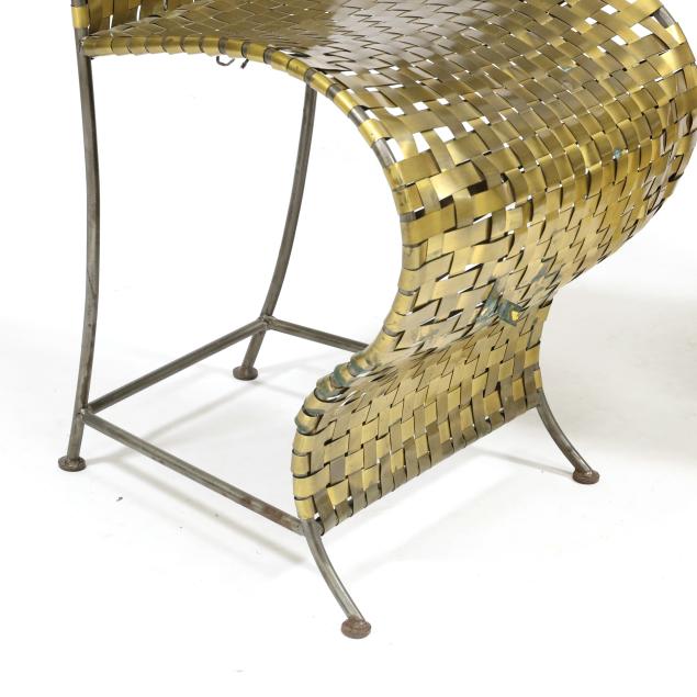 Late 20th century, carbon steel frame with woven brass tall back and shaped seat, EMI cable woven back seam, etched signature at back.