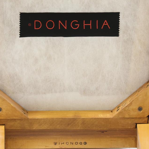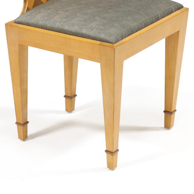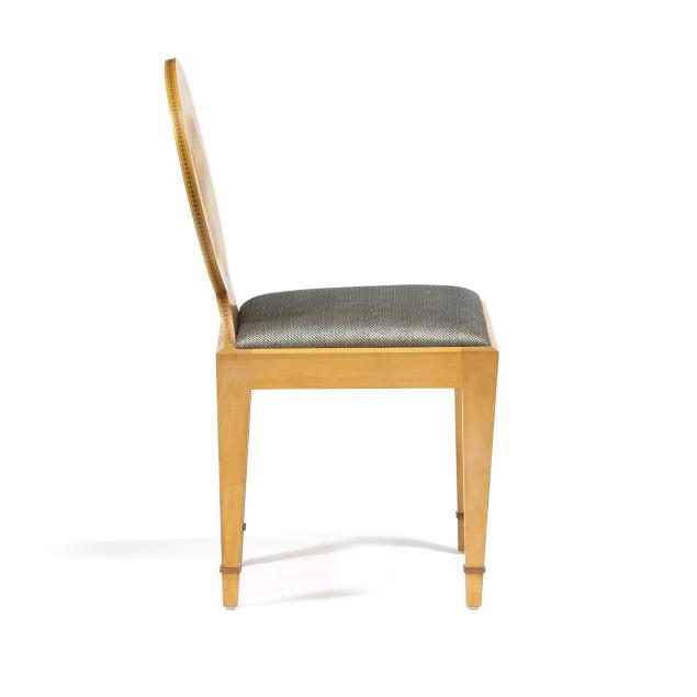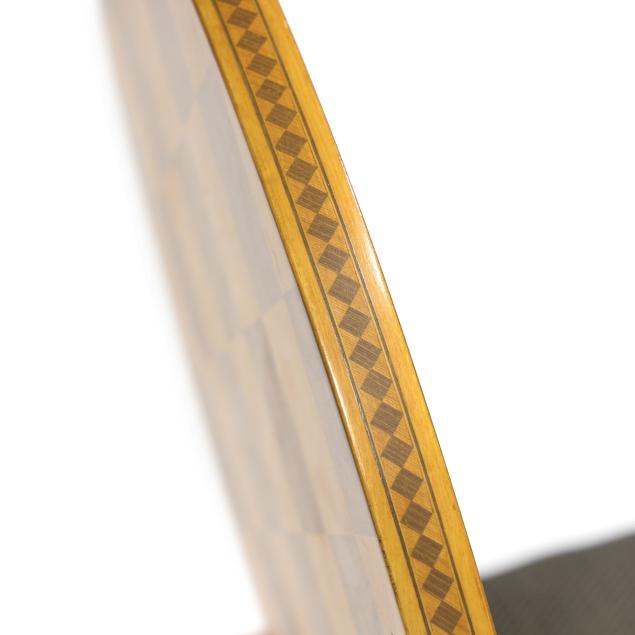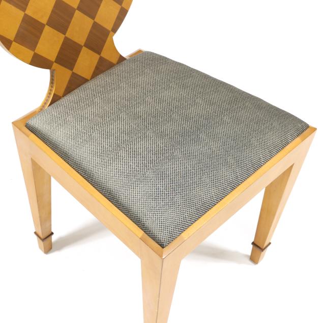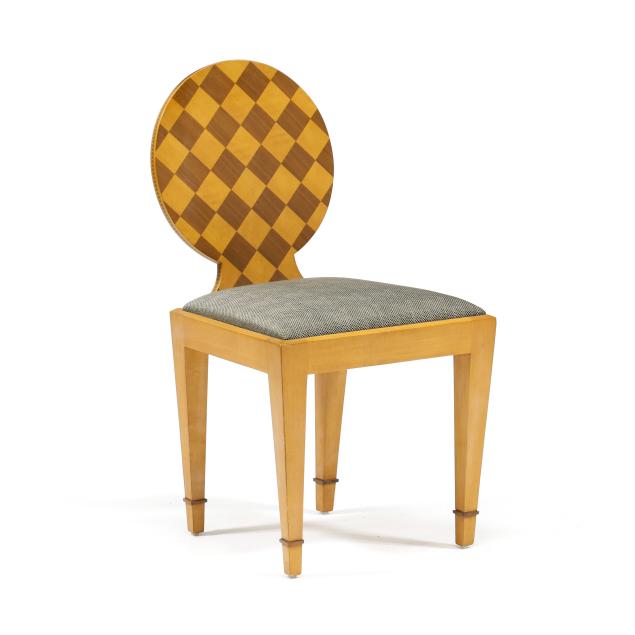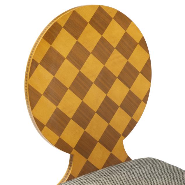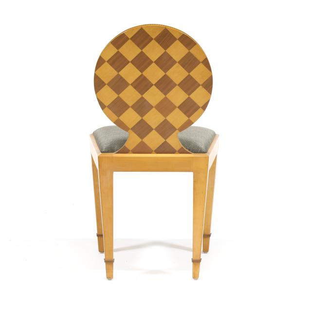 Late 20th century, for Donghia, walnut and cherry, circular back with checkerboard inlay with repeating inlay to the edges, upholstered slip seat, straight tapered legs with spade feet, labeled.