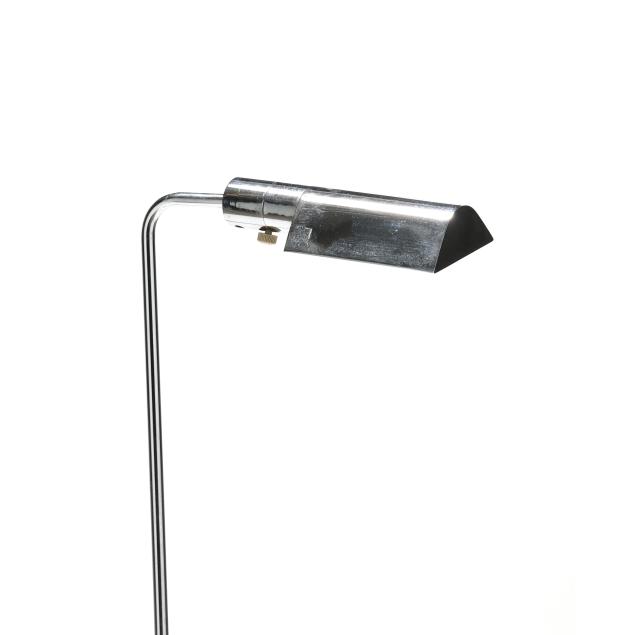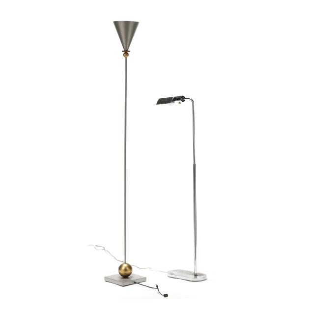 Circa 1980, the first a satin finished silver and gold tone torchiere floor lamp with metal heat shade by Robert Sonneman for George Kovacs, labeled to underside (69 1/2 x 8 x 8 in.), the second a chrome pharmacy floor lamp attributed to George Kovacs, no longer labeled (49 1/4 x 16 x 6 in.).