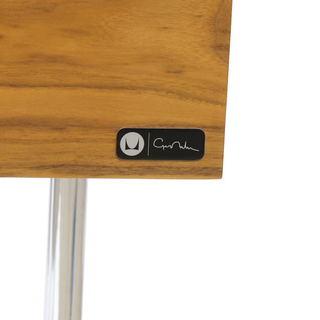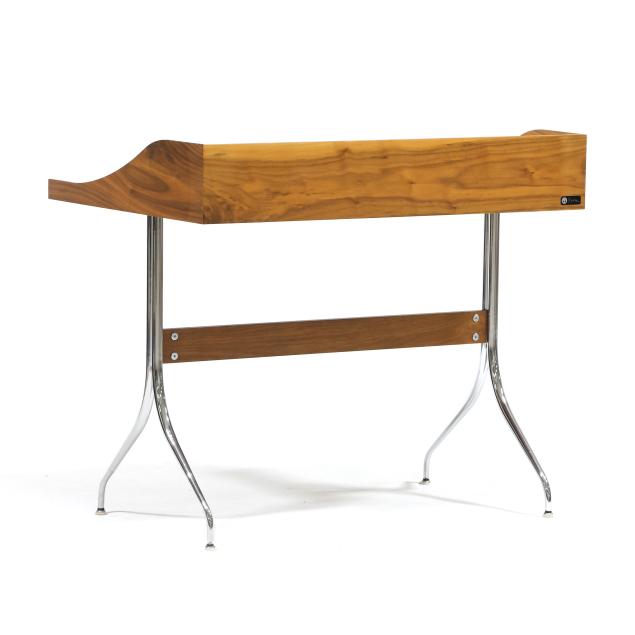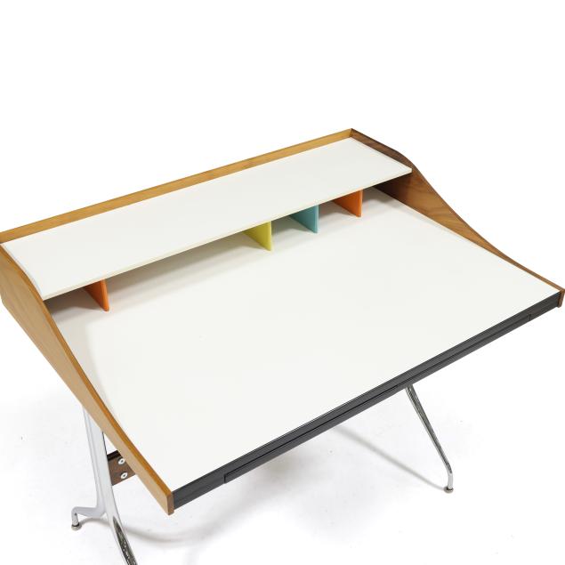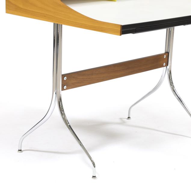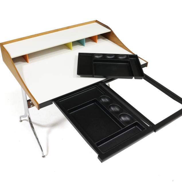 Herman Miller, late-20th-century production, walnut veneer, laminate, black plastic and polished steel, featuring two lower drawers with divided compartments, finished on all sides, labeled.