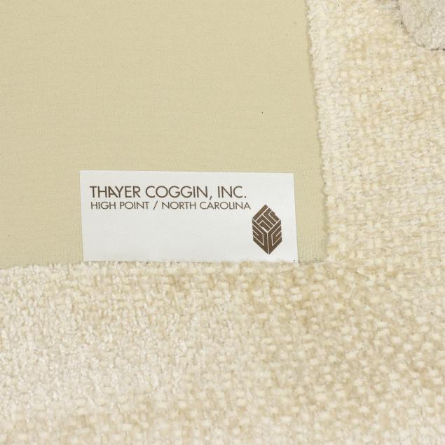 Thayer Coggin, circa 1960, plush off-white upholstery with a down-mix back cushion and loose seat cushion, together with a plush geometric brown down-mix throw pillow, labeled.