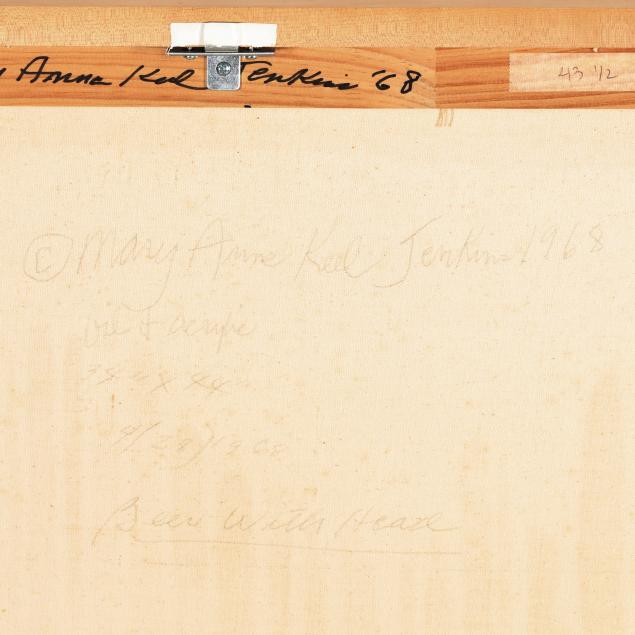 Mary Anne Keel Jenkins was born in Stokes, NC in 1929 and moved with her family to Greenville in 1932. After a year at East Carolina University, she left to study at the Ferree School of Art in Raleigh (closed in 1954) where she earned a diploma in Fine Art. She found employment at the Raleigh Times as display advertising account executive. After her marriage in 1954, she was determined to develop a career as an artist. She succeeded and exhibited in numerous shows throughout her prolific five decade career. The Greenville Museum of Art showcased a retrospective of her work in 1999-2000.