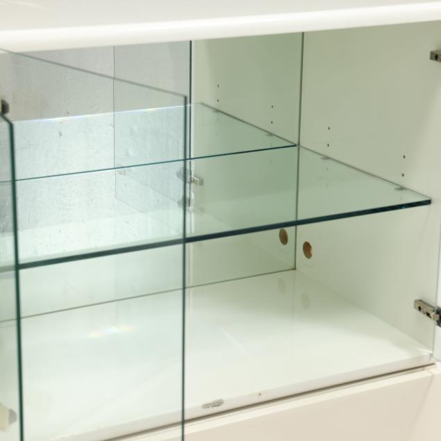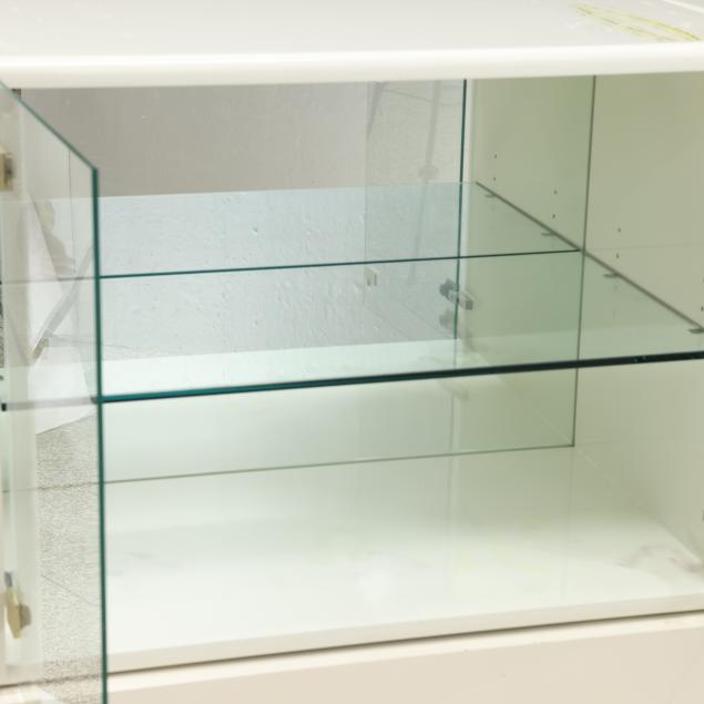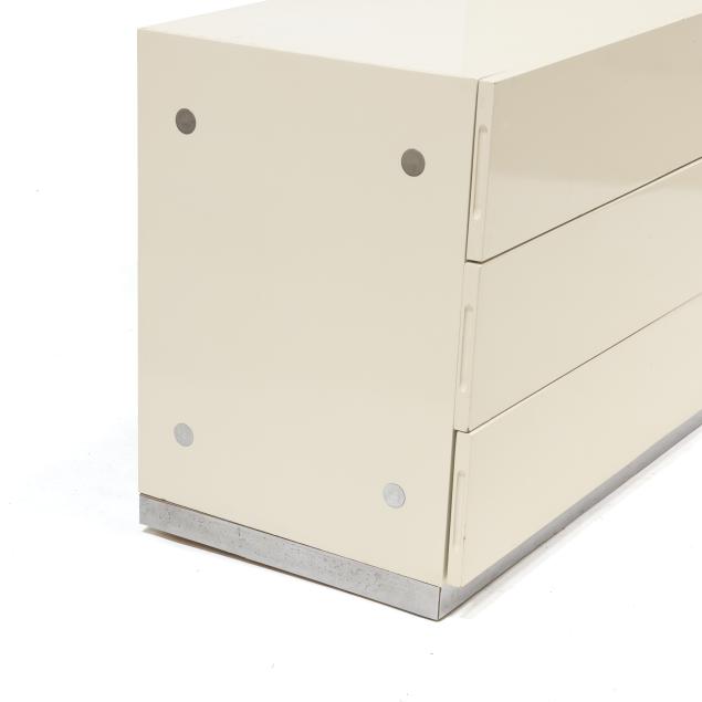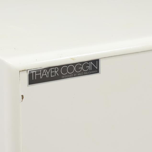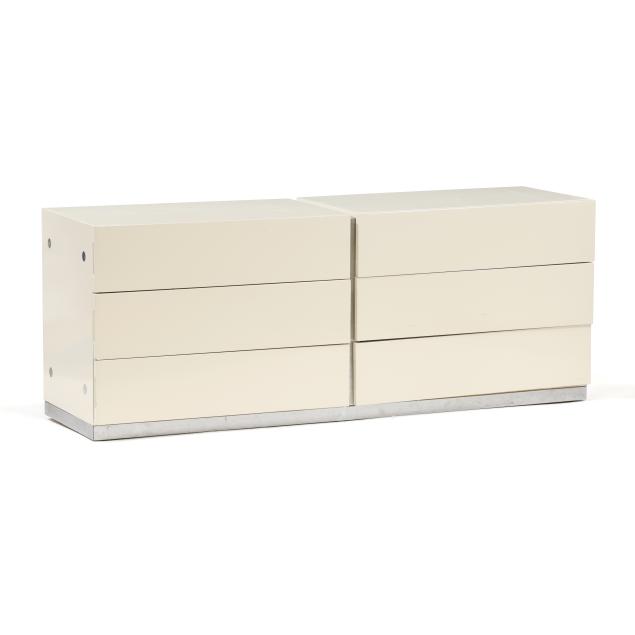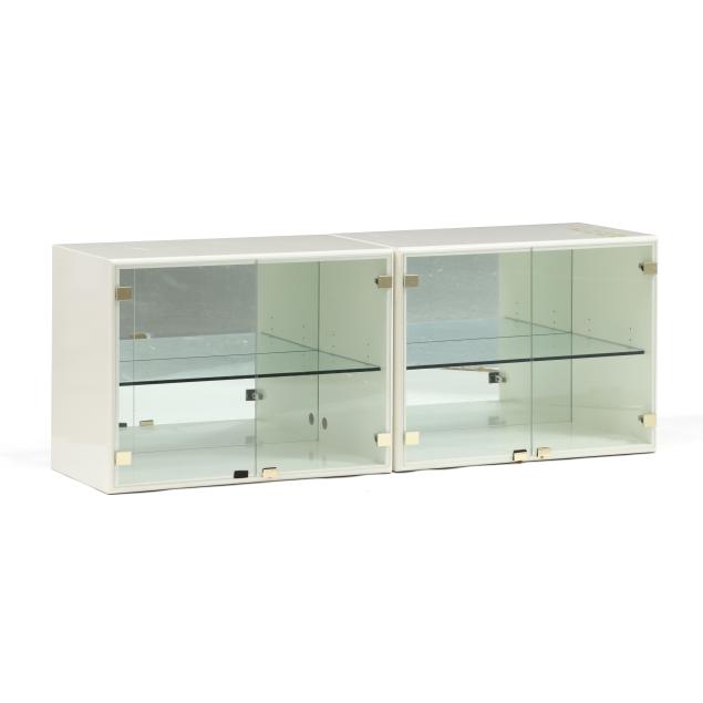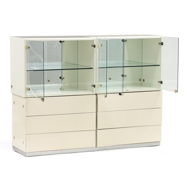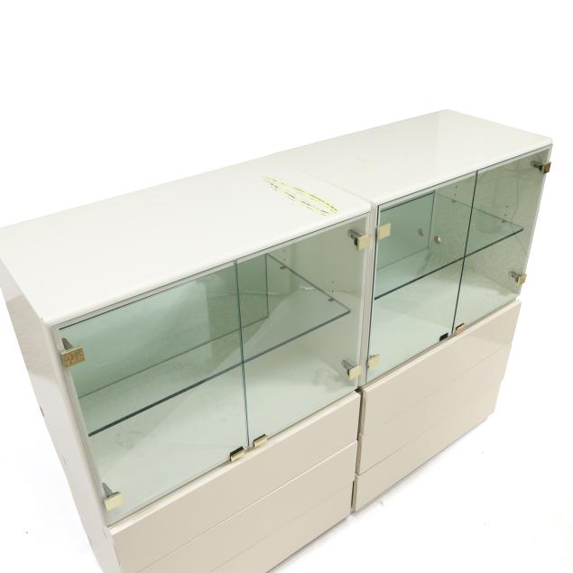 Thayer Coggin, circa 1970, including a six drawer double dresser with chrome accents (25 x 63 x 18 in.); and a pair of glass door display cabinets with single glass shelf, mirrored back and brass accents (24 x 32 x 18 in.), cabinets are labeled.