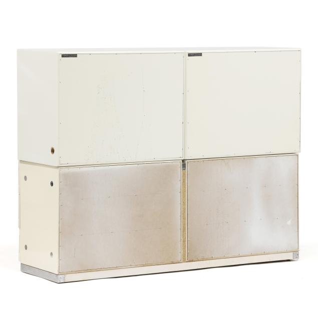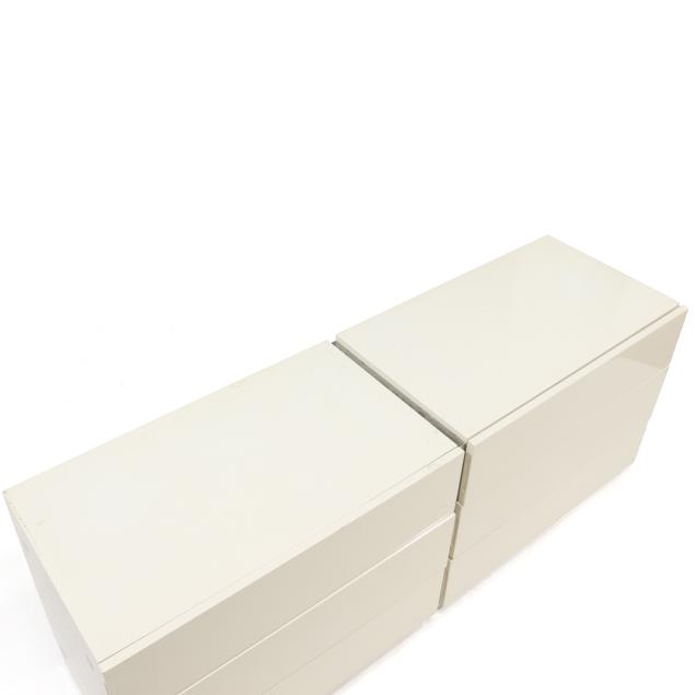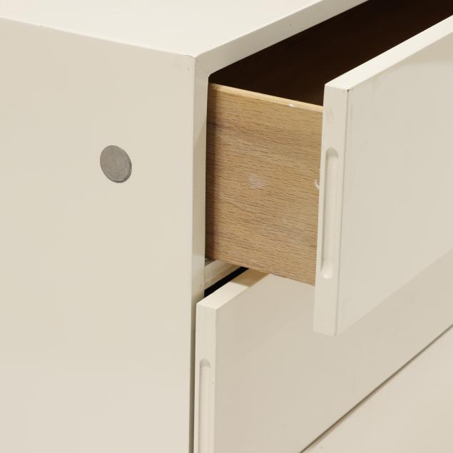 From the Estate of the late Thayer Coggin and Doris "Dot" Royals Coggin, High Point, North Carolina The double dresser in overall good vintage condition with some very small lacquer chips; one cabinet missing a brass handle; the other cabinet with dark marks to the top and staining to interior bottom surface.