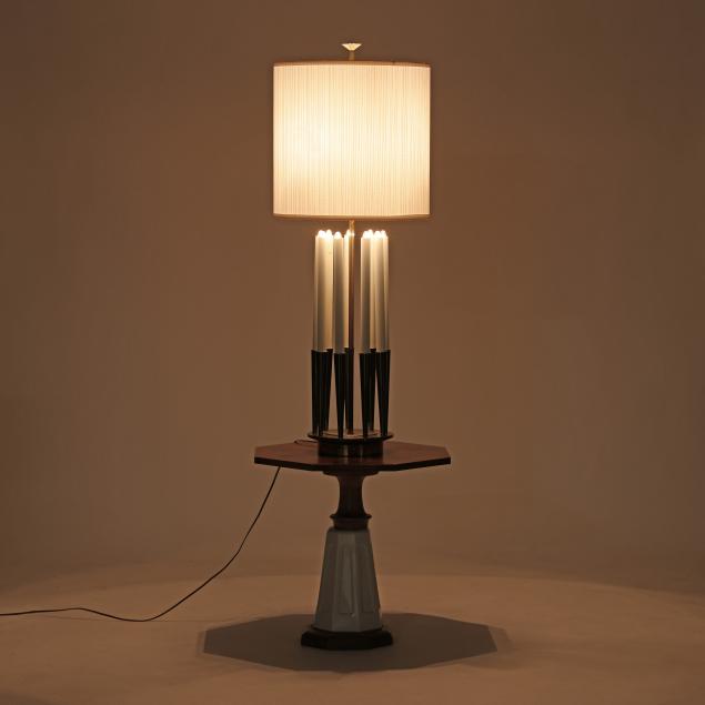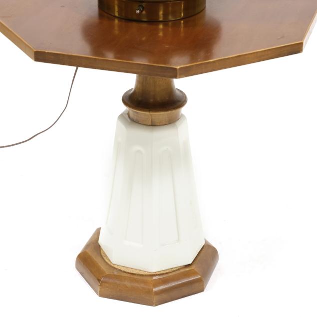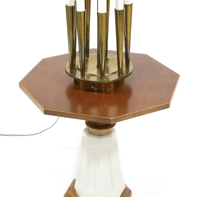 Circa 1960, dual light brass lamp with three inner drum shade lights and nine-lower candle lights, set on a rare Drexel octagonal walnut and white porcelain stand, unmarked.