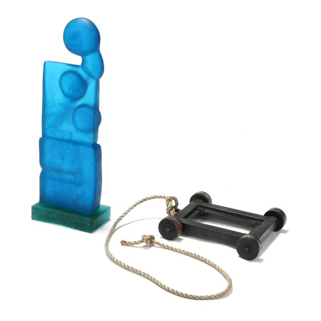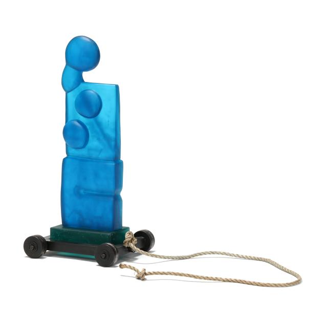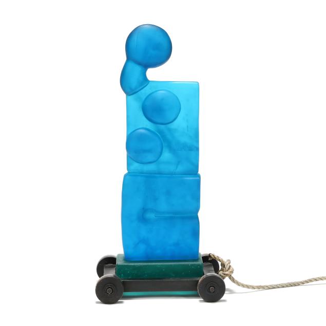 2017, cast and cold sculpted glass set on a custom iron base with wheels and rope, signed.