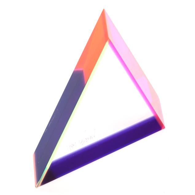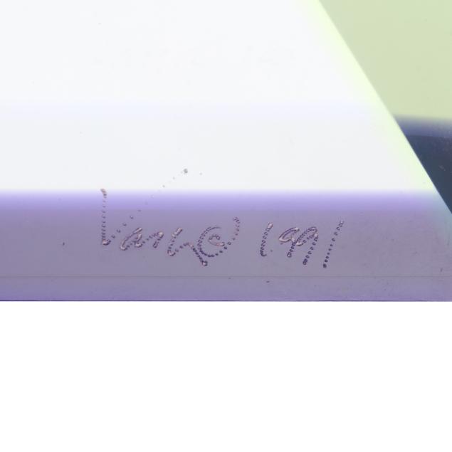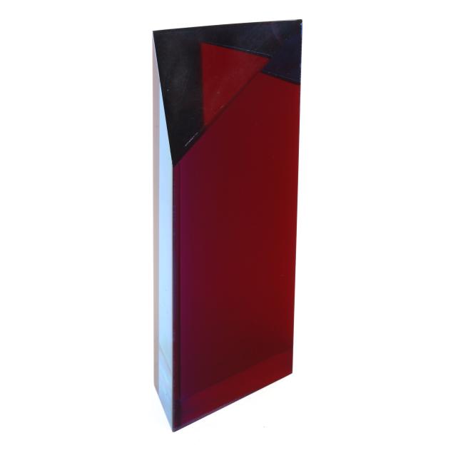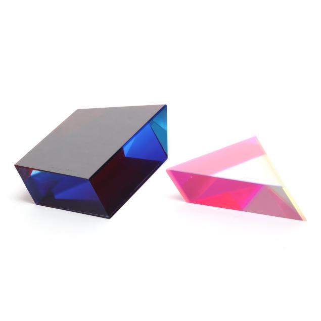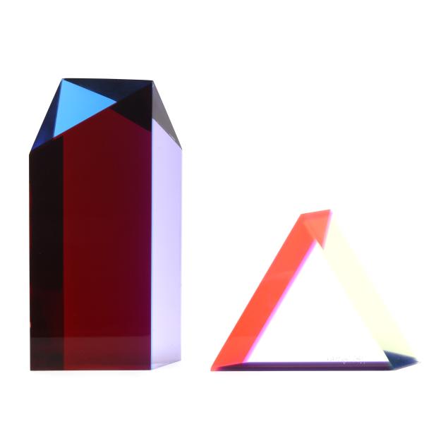 Cast laminated acrylic, the first a quadrilateral pillar inscribed "Vasa © 1990" to base (8 x 4 1/2 x 1 5/8 in.); the second a triangular wedge inscribed "Vasa © 1991" to base (4 3/8 x 6 x 1 3/8 in.).