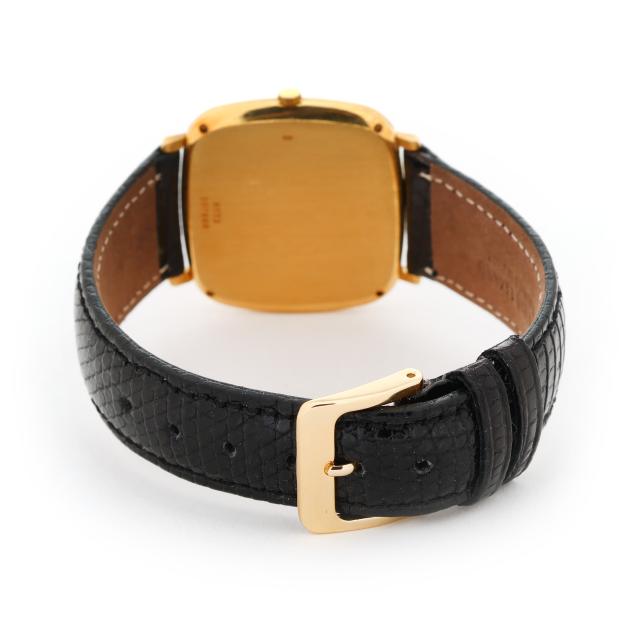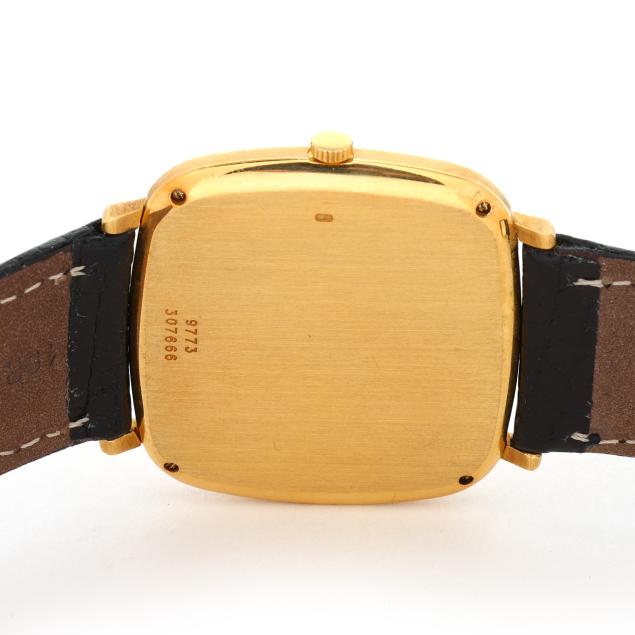 Manual wind, Piaget 9P, reference number 9773, serial number 307666, movement number 779143, the cushion-shaped gold case with brushed bezel and Swiss hallmark for 18KT, the signed gold-tone dial with gold Dauphine hands, the black lizard leather strap marked Genuine Lizard / Made in Italy, completed with gold-tone buckle, the caseback numbered and with Swiss hallmark for 18KT.