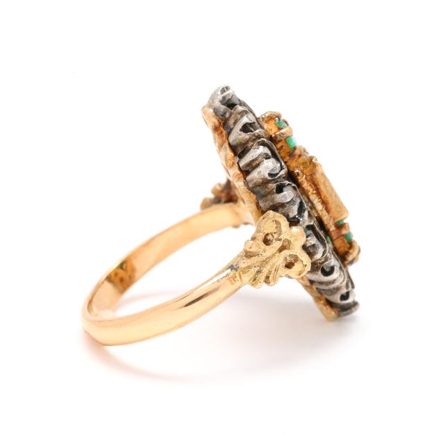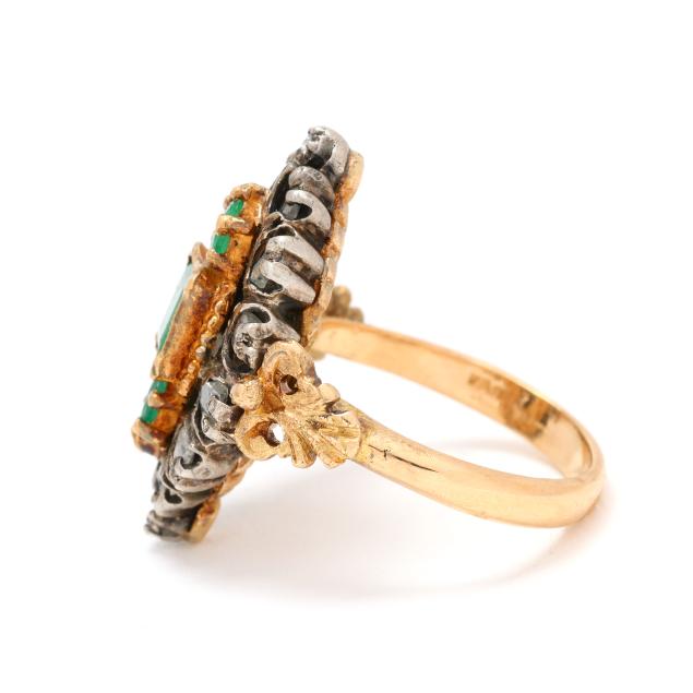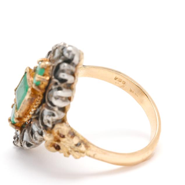 The antique style setting with round and square cut emeralds weighing approximately .65 total carat, set in gold atop a silver setting with polki cut diamonds, with gold frame and shank, stamped 750, testing 18KT and silver.